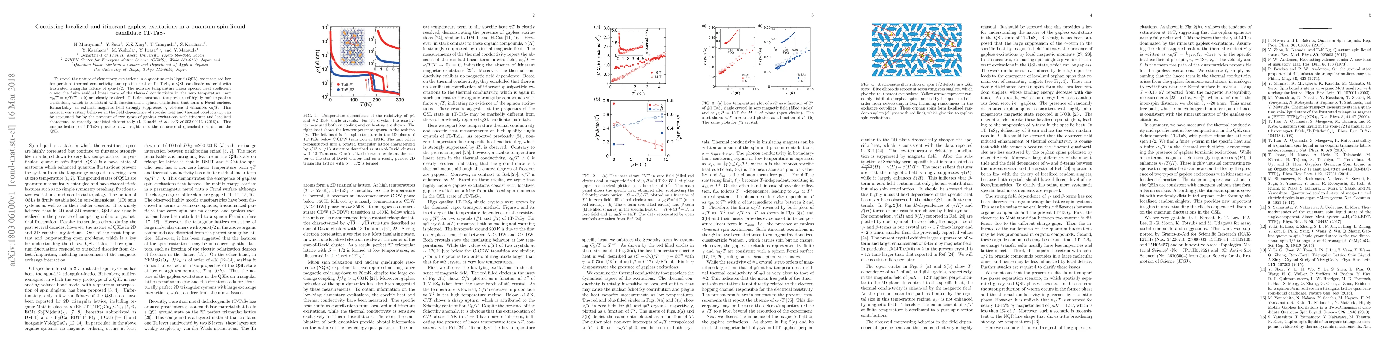 The study reveals the coexistence of localized and itinerant gapless excitations in the quantum spin liquid candidate 1T-TaS$_2$, as evidenced by distinct temperature dependencies of thermal conductivity and specific heat. This unique behavior under magnetic fields provides new insights into the role of disorder in quantum spin liquids.