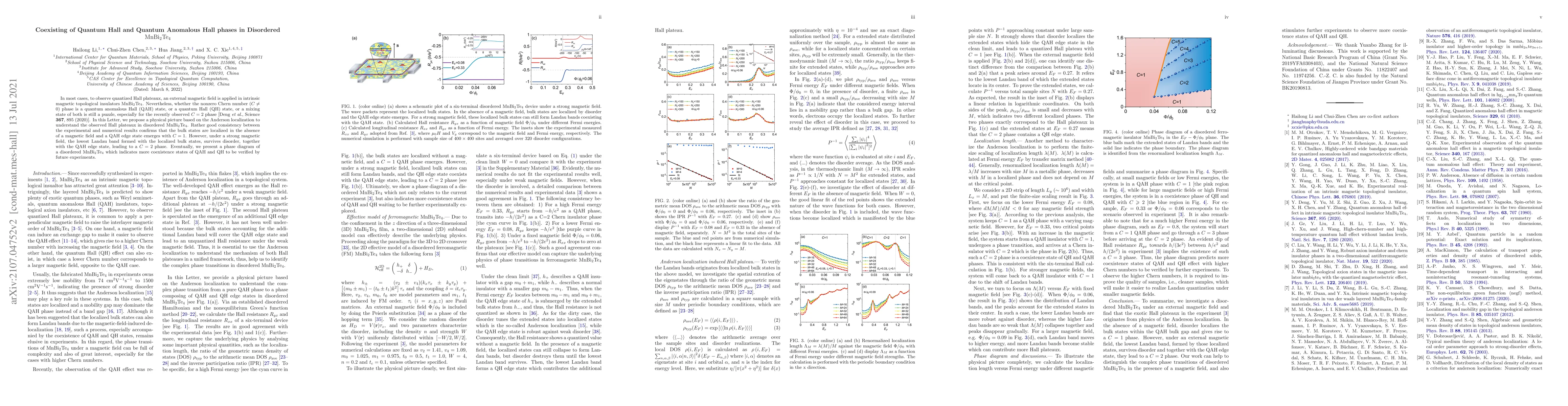 In most cases, to observe quantized Hall plateaux, an external magnetic field is applied in intrinsic magnetic topological insulators $\mathrm{MnBi_2Te_4}$. Nevertheless, whether the nonzero Chern number ($C\neq 0$) phase is a quantum anomalous Hall (QAH) state, or a quantum Hall (QH) state, or a mixing state of both is still a puzzle, especially for the recently observed $C=2$ phase [Deng \textit{et al}., Science \textbf{367}, 895 (2020)]. In this Letter, we propose a physical picture based on the Anderson localization to understand the observed Hall plateaux in disordered $\mathrm{MnBi_2Te_4}$. Rather good consistency between the experimental and numerical results confirms that the bulk states are localized in the absence of a magnetic field and a QAH edge state emerges with $C=1$. However, under a strong magnetic field, the lowest Landau band formed with the localized bulk states, survives disorder, together with the QAH edge state, leading to a $C=2$ phase. Eventually, we present a phase diagram of a disordered $\mathrm{MnBi_2Te_4}$ which indicates more coexistence states of QAH and QH to be verified by future experiments.