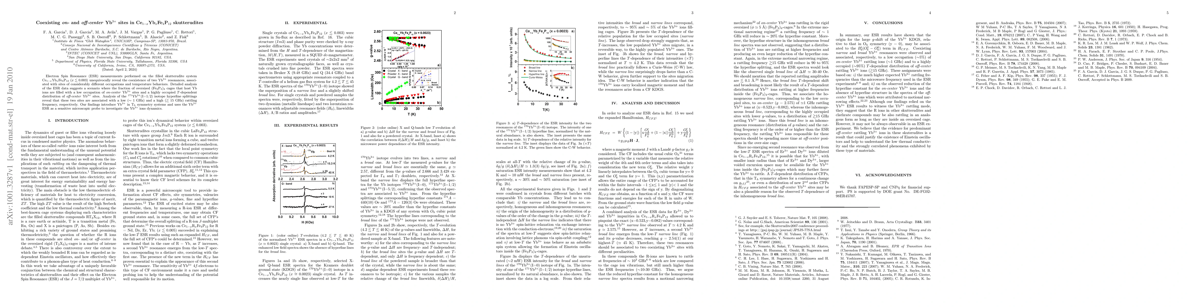 Electron Spin Resonance (ESR) measurements performed on the filled skutterudite system Ce1-x$YbxFe4P12 (x< 0.003) unequivocally reveal the coexistence of two Yb3+ resonances, associated with sites of considerably different occupations and temperature behaviors. Detailed analysis of the ESR data suggests a scenario where the fraction of oversized (Fe2P3)4 cages that host Yb ions are filled with a low occupation of on-center Yb3+ sites and a highly occupied T-dependent distribution of off-center Yb3+ sites. Analysis of the 171Yb3+ (I=1/2) isotope hyperfine splittings reveal that these two sites are associated with a low (~ 1 GHz) and a high (> 15 GHz) rattling frequency, respectively. Our findings introduce Yb3+ in Th symmetry systems and uses the Yb3+ ESR as a sensitive microscopic probe to investigate the Yb3+ ions dynamics.