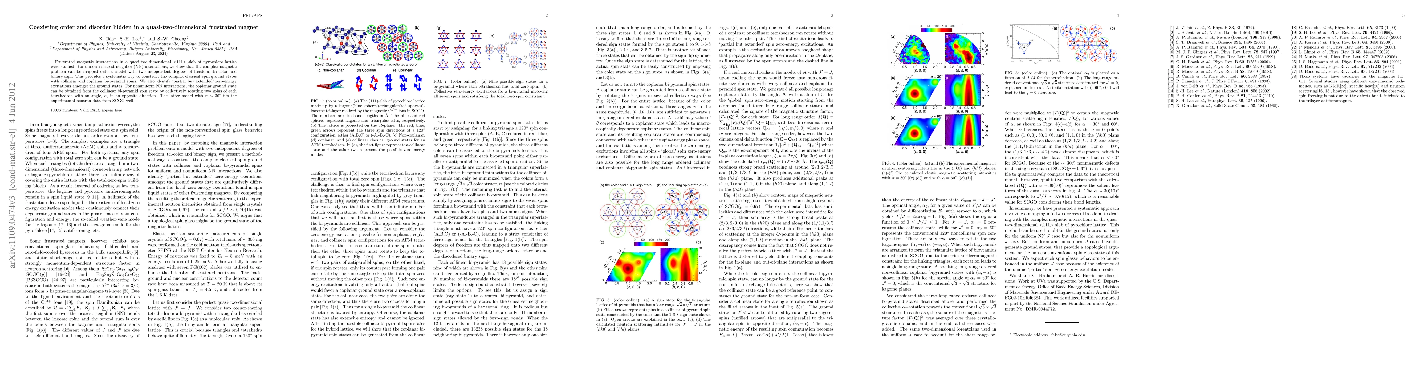 Frustrated magnetic interactions in a quasi-two-dimensional [111] slab of pyrochlore lattice were studied. For uniform nearest neighbor (NN) interactions, we show that the complex magnetic problem can be mapped onto a model with two independent degrees of freedom, tri-color and binary sign. This provides a systematic way to construct the complex classical spin ground states with collinear and coplanar bi-pyramid spins. We also identify `partial but extended' zero-energy excitations amongst the ground states. For nonuniform NN interactions, the coplanar ground state can be obtained from the collinear bi-pyramid spin state by collectively rotating two spins of each tetrahedron with an angle, $\alpha$, in an opposite direction. The latter model with $\alpha \sim 30^\circ$ fits the experimental neutron data from SCGO well.