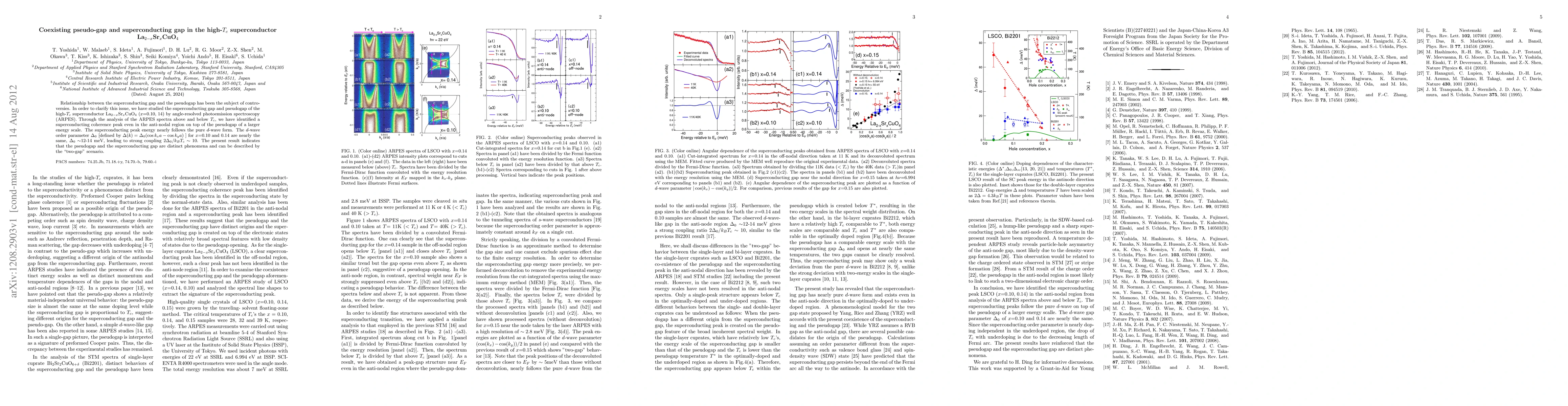 This study reveals the coexistence of a pseudogap and a superconducting gap in La2-xSrxCuO4 using ARPES, identifying a d-wave superconducting coherence peak atop the pseudogap. The results support a "two-gap" model where the pseudogap and superconducting gap are distinct phenomena.