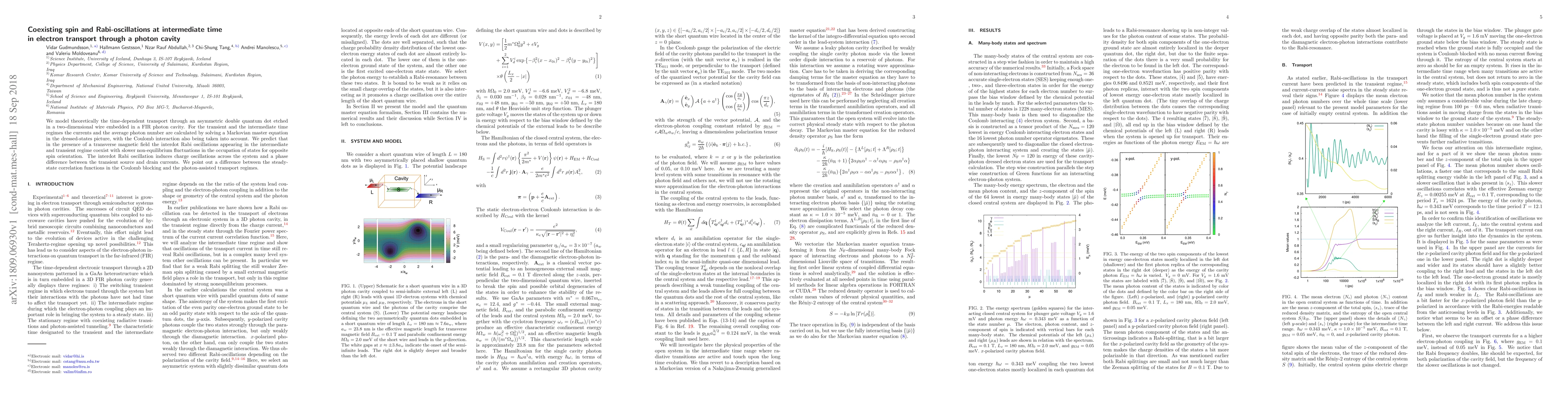 This paper theoretically models electron transport through a double quantum dot in a photon cavity, predicting that interdot Rabi oscillations coexist with spin-dependent fluctuations in intermediate time regimes. The study highlights charge oscillations and phase differences in currents, contrasting steady-state correlations in Coulomb blocking versus photon-assisted transport.