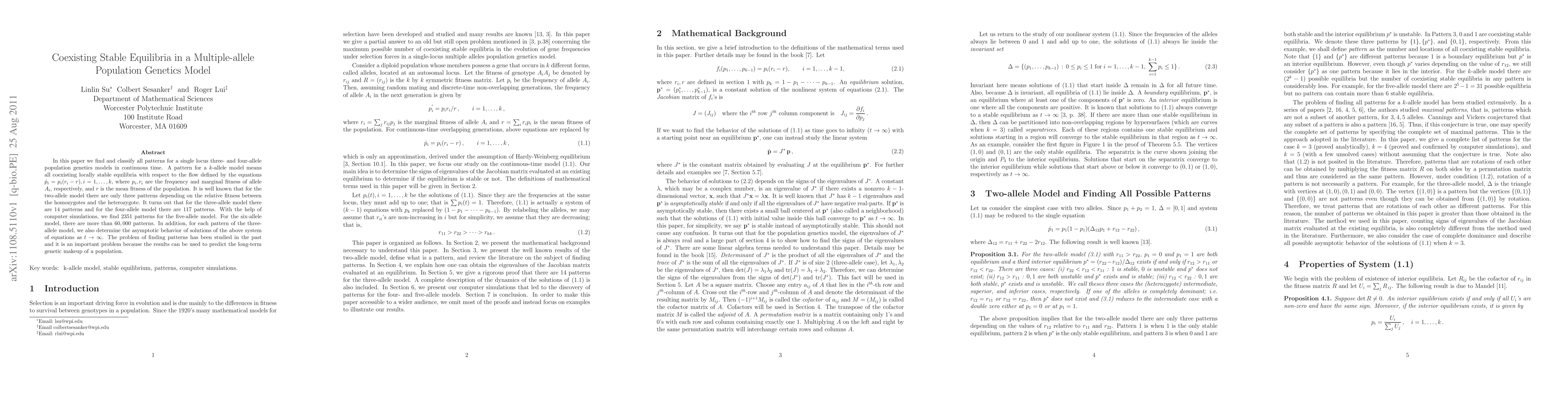 This paper identifies and classifies all coexisting locally stable equilibria for three- and four-allele population genetics models, revealing 14 and 117 patterns respectively. The study extends to five- and six-allele models, uncovering 2351 and over 60,000 patterns, respectively, highlighting the complexity and importance of predicting long-term genetic makeup.