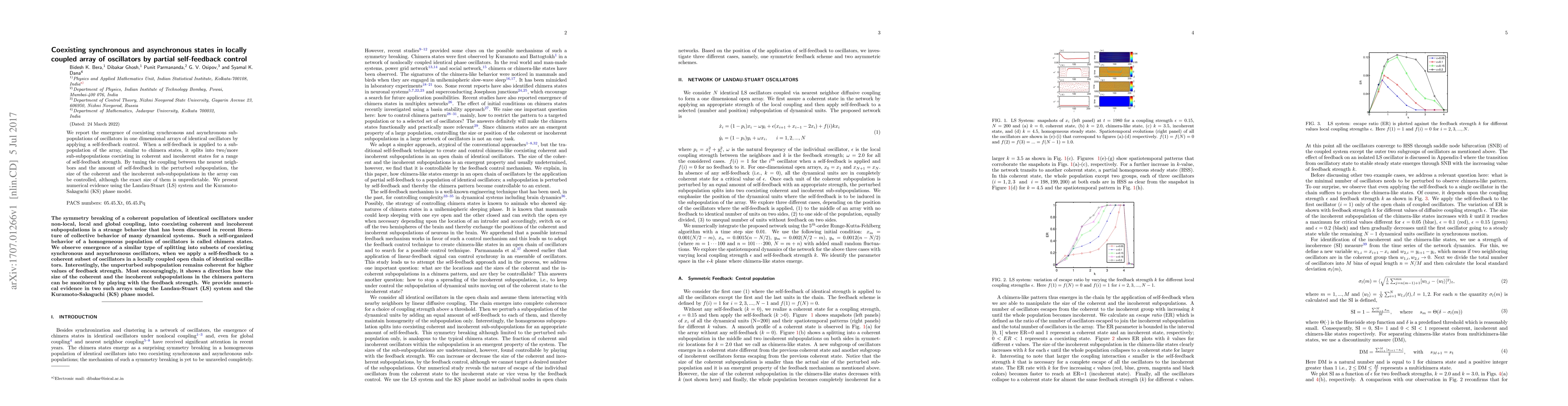 We report the emergence of coexisting synchronous and asynchronous subpopulations of oscillators in one dimensional arrays of identical oscillators by applying a self-feedback control. When a self-feedback is applied to a subpopulation of the array, similar to chimera states, it splits into two/more sub-subpopulations coexisting in coherent and incoherent states for a range of self-feedback strength. By tuning the coupling between the nearest neighbors and the amount of self-feedback in the perturbed subpopulation, the size of the coherent and the incoherent sub-subpopulations in the array can be controlled, although the exact size of them is unpredictable. We present numerical evidence using the Landau-Stuart (LS) system and the Kuramoto-Sakaguchi (KS) phase model.