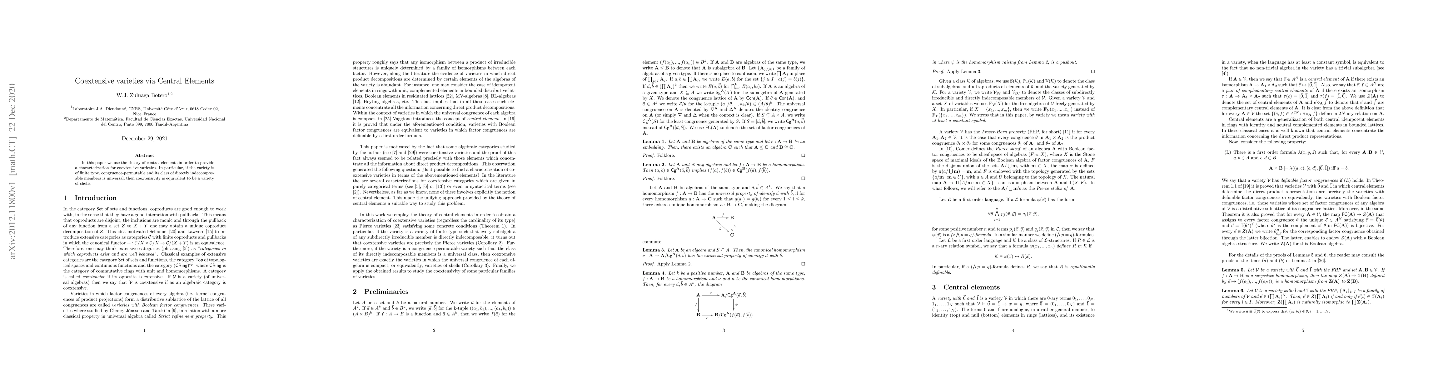 In this paper we use the theory of central elements in order to provide a characterization for coextensive varieties. In particular, if the variety is of finite type, congruence-permutable and its class of directly indecomposable members is universal, then coextensivity is equivalent to be a variety of shells.