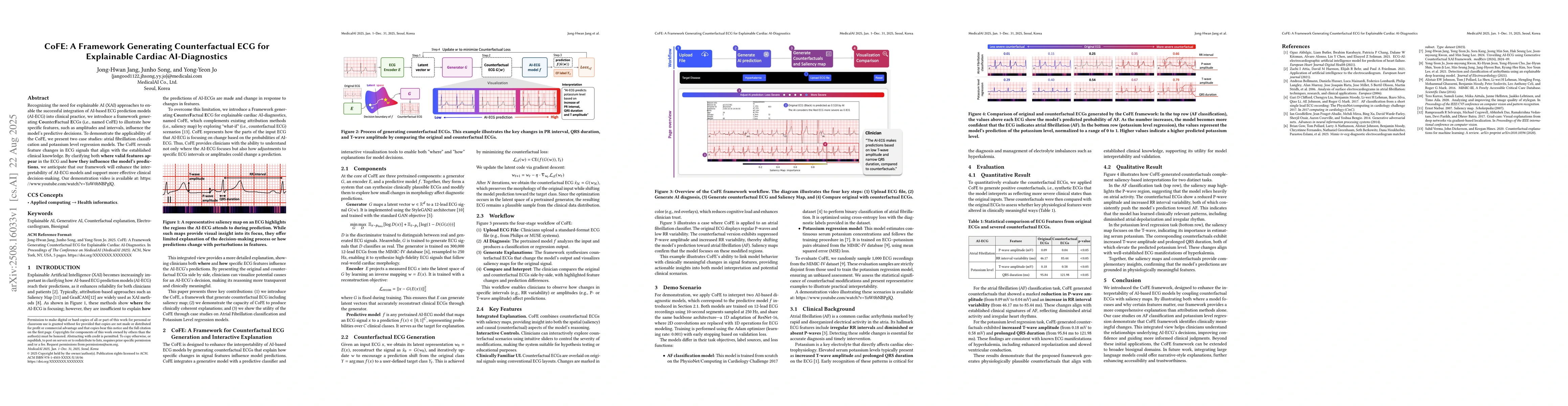 Recognizing the need for explainable AI (XAI) approaches to enable the successful integration of AI-based ECG prediction models (AI-ECG) into clinical practice, we introduce a framework generating \textbf{Co}unter\textbf{F}actual \textbf{E}CGs (i,e., named CoFE) to illustrate how specific features, such as amplitudes and intervals, influence the model's predictive decisions. To demonstrate the applicability of the CoFE, we present two case studies: atrial fibrillation classification and potassium level regression models. The CoFE reveals feature changes in ECG signals that align with the established clinical knowledge. By clarifying both \textbf{where valid features appear} in the ECG and \textbf{how they influence the model's predictions}, we anticipate that our framework will enhance the interpretability of AI-ECG models and support more effective clinical decision-making. Our demonstration video is available at: https://www.youtube.com/watch?v=YoW0bNBPglQ.