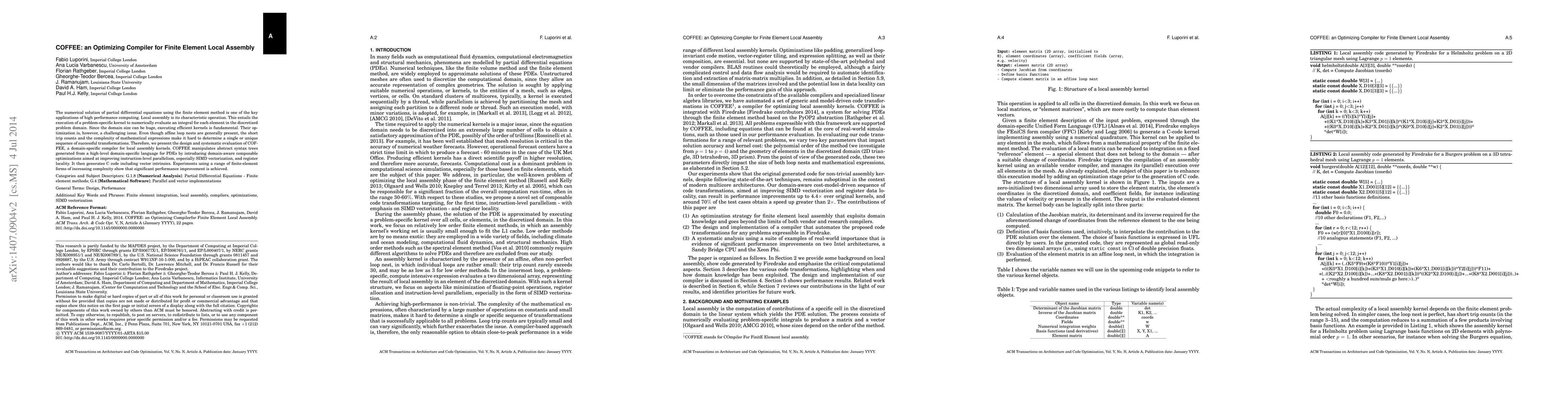 Researchers designed COFFEE, a compiler that optimizes finite element local assembly kernels for better performance, achieving significant improvements in complex PDE simulations.