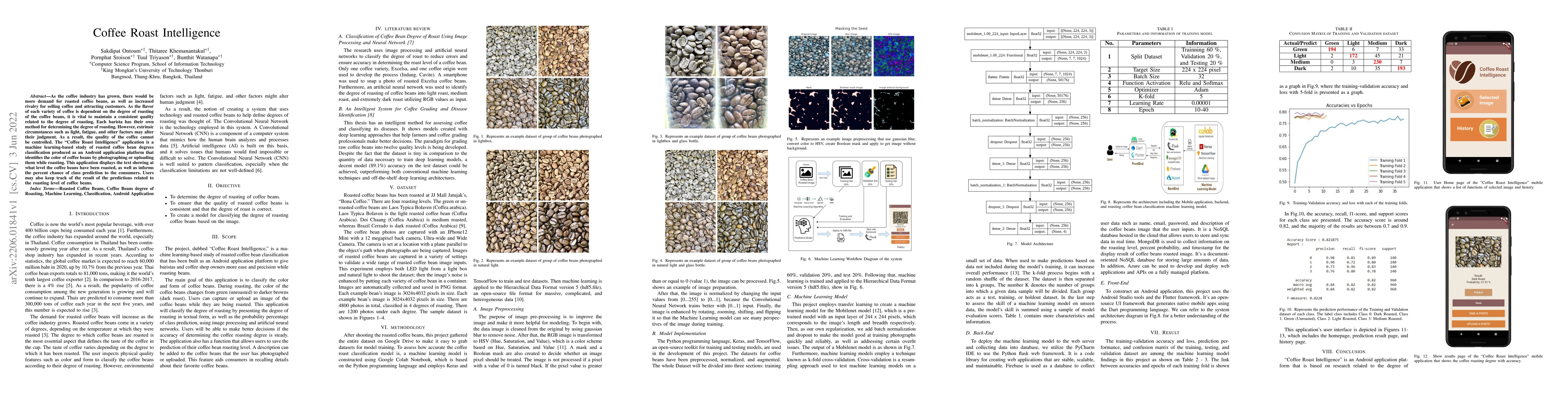 As the coffee industry has grown, there would be more demand for roasted coffee beans, as well as increased rivalry for selling coffee and attracting customers. As the flavor of each variety of coffee is dependent on the degree of roasting of the coffee beans, it is vital to maintain a consistent quality related to the degree of roasting. Each barista has their own method for determining the degree of roasting. However, extrinsic circumstances such as light, fatigue, and other factors may alter their judgment. As a result, the quality of the coffee cannot be controlled. The Coffee Roast Intelligence application is a machine learning-based study of roasted coffee bean degrees classification produced as an Android application platform that identifies the color of coffee beans by photographing or uploading them while roasting. This application displays the text showing at what level the coffee beans have been roasted, as well as informs the percent chance of class prediction to the consumers. Users may also keep track of the result of the predictions related to the roasting level of coffee beans.