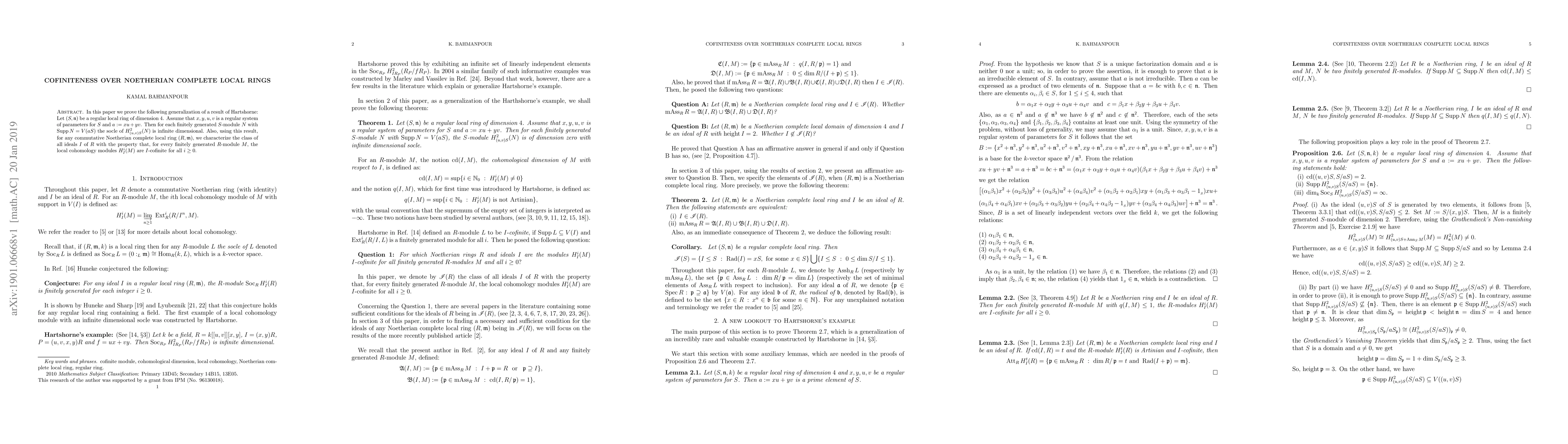 In this paper we prove the following generalization of a result of Hartshorne: Let $(S,\n)$ be a regular local ring of dimension $4$. Assume that $x,y,u,v$ is a regular system of parameters for $S$ and $a:=xu+yv$. Then for each finitely generated $S$-module $N$ with $\Supp N=V(aS)$ the socle of $H^2_{(u,v)S}(N)$ is infinite dimensional. Also, using this result, for any commutative Noetherian complete local ring $(R,\m)$, we characterize the class of all ideals $I$ of $R$ with the property that, for every finitely generated $R$-module $M$, the local cohomology modules $H^i_I(M)$ are $I$-cofinite for all $i\geq 0$.