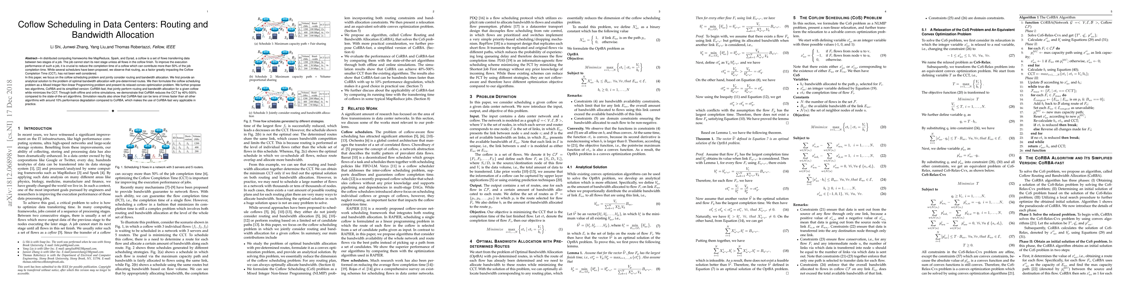 This paper proposes algorithms for coflow scheduling in data centers, focusing on routing and bandwidth allocation to minimize Coflow Completion Time (CCT). It introduces CoRBA and its simplified version CoRBA-fast, demonstrating significant reductions in CCT compared to existing methods, with CoRBA-fast offering faster performance suitable for practical use.
