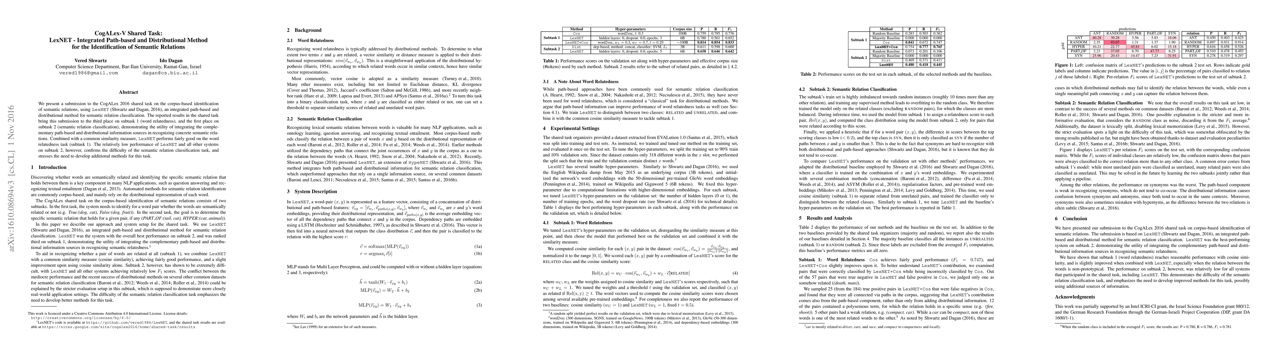 We present a submission to the CogALex 2016 shared task on the corpus-based identification of semantic relations, using LexNET (Shwartz and Dagan, 2016), an integrated path-based and distributional method for semantic relation classification. The reported results in the shared task bring this submission to the third place on subtask 1 (word relatedness), and the first place on subtask 2 (semantic relation classification), demonstrating the utility of integrating the complementary path-based and distributional information sources in recognizing concrete semantic relations. Combined with a common similarity measure, LexNET performs fairly good on the word relatedness task (subtask 1). The relatively low performance of LexNET and all other systems on subtask 2, however, confirms the difficulty of the semantic relation classification task, and stresses the need to develop additional methods for this task.
