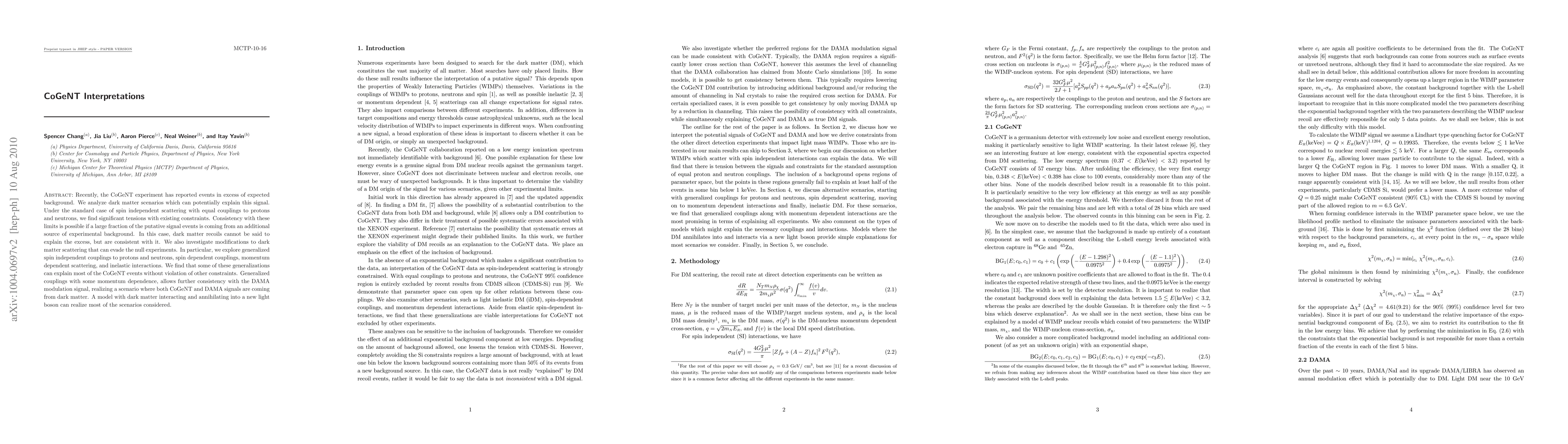 The research analyzes the CoGeNT experiment's reported excess events, exploring dark matter scenarios that could potentially explain the signal. It considers standard spin-independent scattering with equal couplings to protons and neutrons, as well as modifications such as generalized spin-independent couplings, spin-dependent couplings, momentum-dependent scattering, and inelastic interactions.
