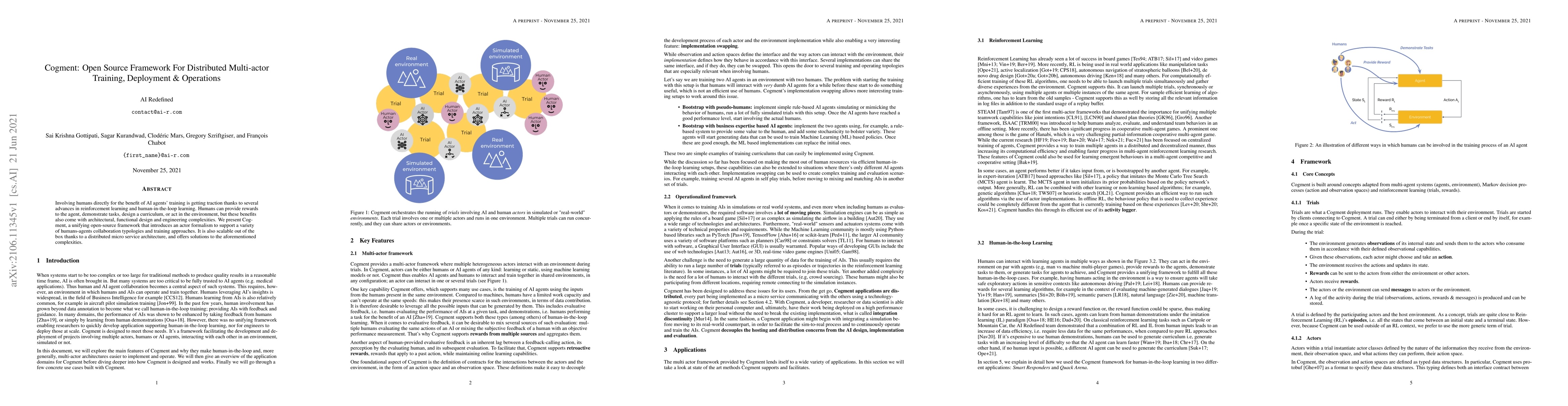 Cogment is an open-source framework addressing complexities in human-AI collaboration for reinforcement learning. It introduces an actor formalism, supports diverse human-agent interaction typologies, and provides scalability through a distributed microservice architecture.
