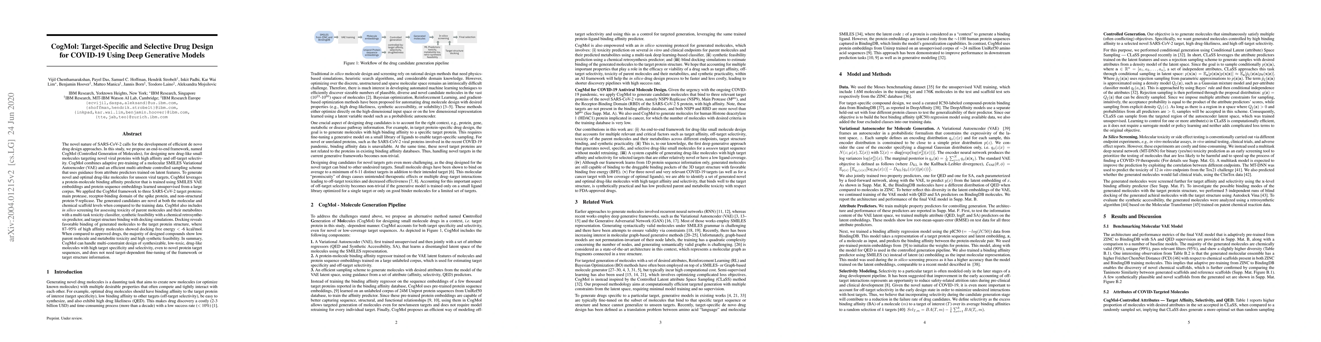 Researchers developed CogMol, a framework for designing novel COVID-19 drugs with high affinity and selectivity, using deep generative models. The approach yielded promising results, including 87-95% of generated molecules showing favorable binding to target proteins.