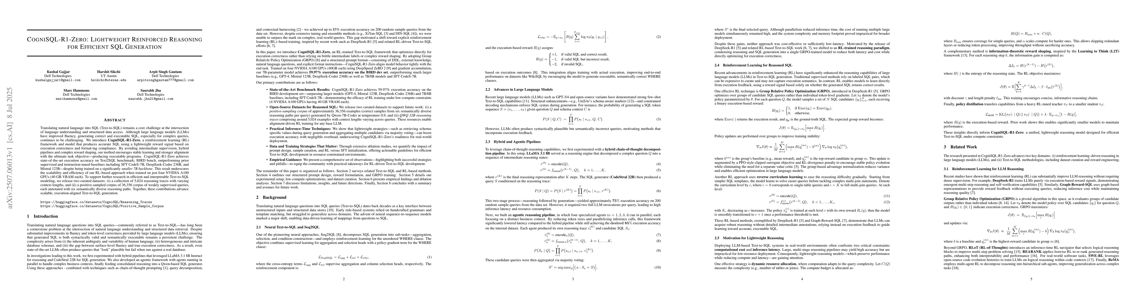 Translating natural language into SQL (Text-to-SQL) remains a core challenge at the intersection of language understanding and structured data access. Although large language models (LLMs) have improved fluency, generating correct and executable SQL, especially for complex queries, continues to be challenging. We introduce CogniSQL-R1-Zero, a reinforcement learning (RL) framework and model that produces accurate SQL using a lightweight reward signal based on execution correctness and format-tag compliance. By avoiding intermediate supervision, hybrid pipelines and complex reward shaping, our method encourages stable learning and stronger alignment with the ultimate task objective-producing executable programs. CogniSQL-R1-Zero achieves state-of-the-art execution accuracy on Text2SQL benchmark; BIRD bench, outperforming prior supervised and instruction-tuned baselines including SFT CodeS-7B, DeepSeek-Coder 236B, and Mistral 123B-despite being trained on a significantly smaller 7B backbone. This result underscores the scalability and efficiency of our RL-based approach when trained on just four NVIDIA A100 GPUs (40 GB VRAM each). To support further research in efficient and interpretable Text-to-SQL modeling, we release two curated datasets: (i) a collection of 5,024 reasoning traces with varying context lengths, and (ii) a positive-sampled corpus of 36,356 corpus of weakly supervised queries, each annotated with six semantically diverse reasoning paths. Together, these contributions advance scalable, execution-aligned Text-to-SQL generation.