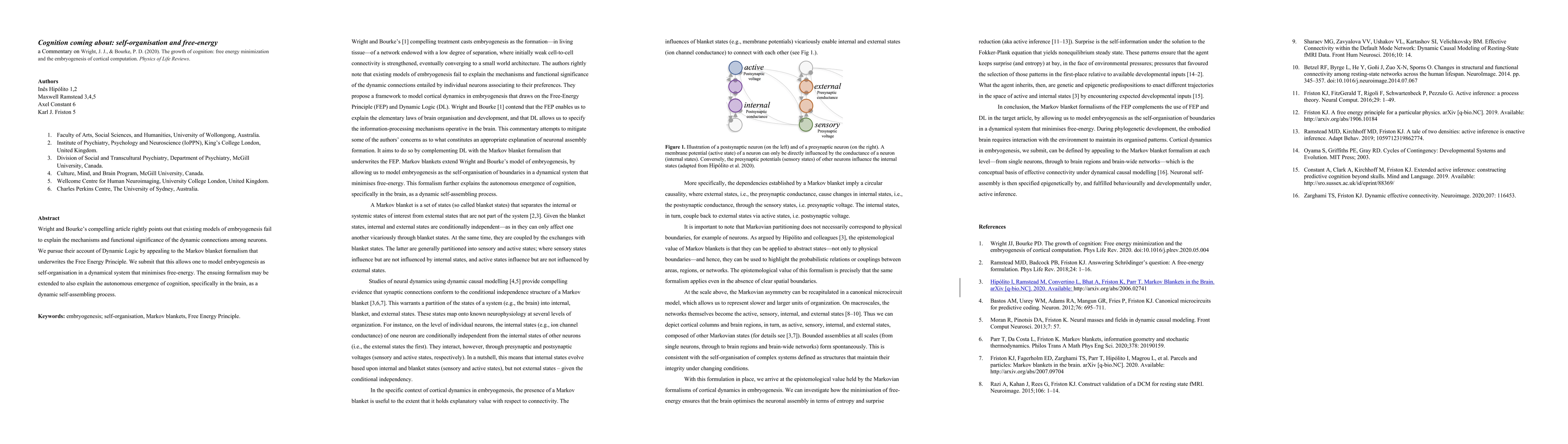 Wright and Bourkes compelling article rightly points out that existing models of embryogenesis fail to explain the mechanisms and functional significance of the dynamic connections among neurons. We pursue their account of Dynamic Logic by appealing to the Markov blanket formalism that underwrites the Free Energy Principle. We submit that this allows one to model embryogenesis as self-organisation in a dynamical system that minimises free-energy. The ensuing formalism may be extended to also explain the autonomous emergence of cognition, specifically in the brain, as a dynamic self-assembling process.