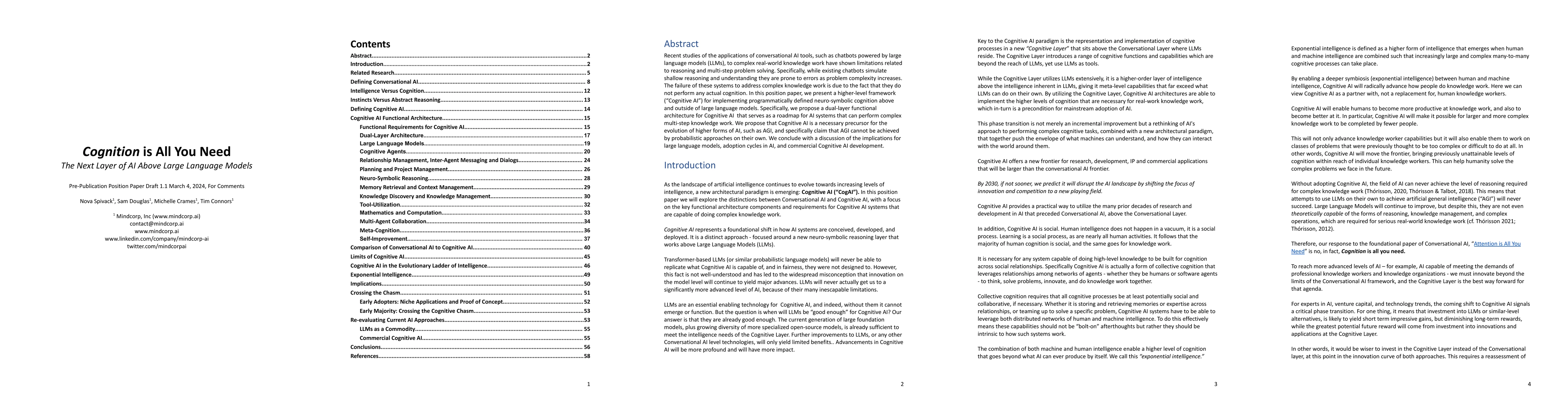 Recent studies of the applications of conversational AI tools, such as chatbots powered by large language models, to complex real-world knowledge work have shown limitations related to reasoning and multi-step problem solving. Specifically, while existing chatbots simulate shallow reasoning and understanding they are prone to errors as problem complexity increases. The failure of these systems to address complex knowledge work is due to the fact that they do not perform any actual cognition. In this position paper, we present Cognitive AI, a higher-level framework for implementing programmatically defined neuro-symbolic cognition above and outside of large language models. Specifically, we propose a dual-layer functional architecture for Cognitive AI that serves as a roadmap for AI systems that can perform complex multi-step knowledge work. We propose that Cognitive AI is a necessary precursor for the evolution of higher forms of AI, such as AGI, and specifically claim that AGI cannot be achieved by probabilistic approaches on their own. We conclude with a discussion of the implications for large language models, adoption cycles in AI, and commercial Cognitive AI development.