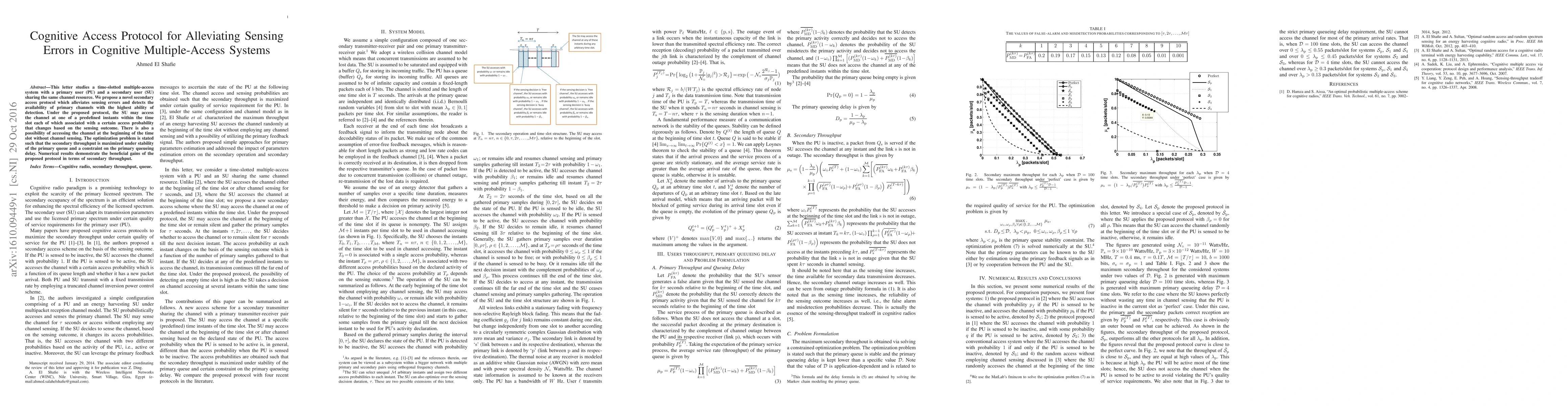 This paper proposes a novel cognitive access protocol to minimize sensing errors in time-slotted multiple-access systems, optimizing secondary throughput while ensuring primary queue stability and delay constraints. Numerical results show significant improvements in secondary throughput under the new protocol.
