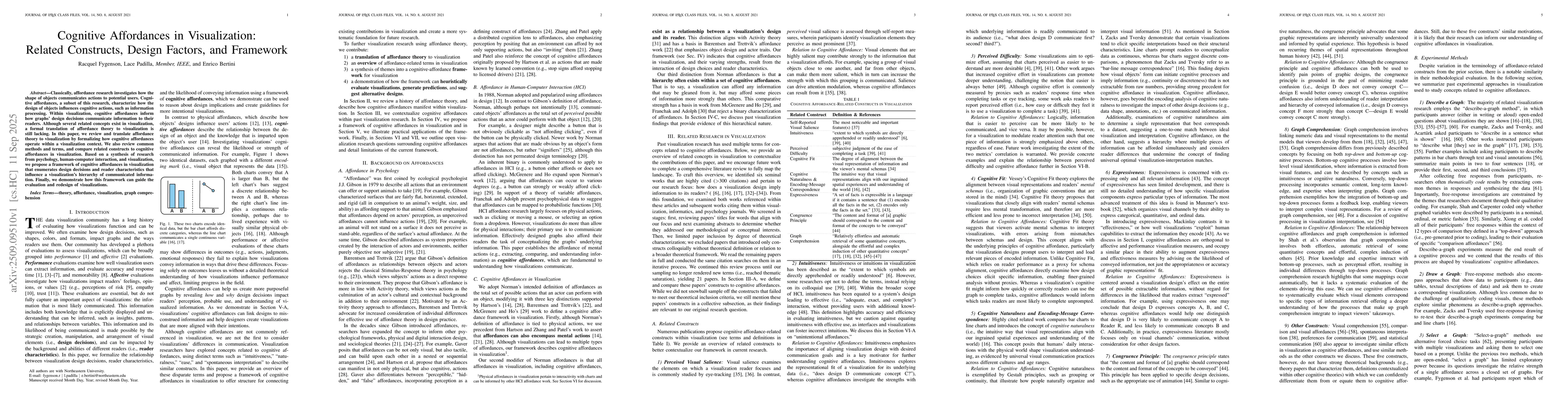 Classically, affordance research investigates how the shape of objects communicates actions to potential users. Cognitive affordances, a subset of this research, characterize how the design of objects influences cognitive actions, such as information processing. Within visualization, cognitive affordances inform how graphs' design decisions communicate information to their readers. Although several related concepts exist in visualization, a formal translation of affordance theory to visualization is still lacking. In this paper, we review and translate affordance theory to visualization by formalizing how cognitive affordances operate within a visualization context. We also review common methods and terms, and compare related constructs to cognitive affordances in visualization. Based on a synthesis of research from psychology, human computer interaction, and visualization, we propose a framework of cognitive affordances in visualization that enumerates design decisions and reader characteristics that influence a visualization's hierarchy of communicated information. Finally, we demonstrate how this framework can guide the evaluation and redesign of visualizations.