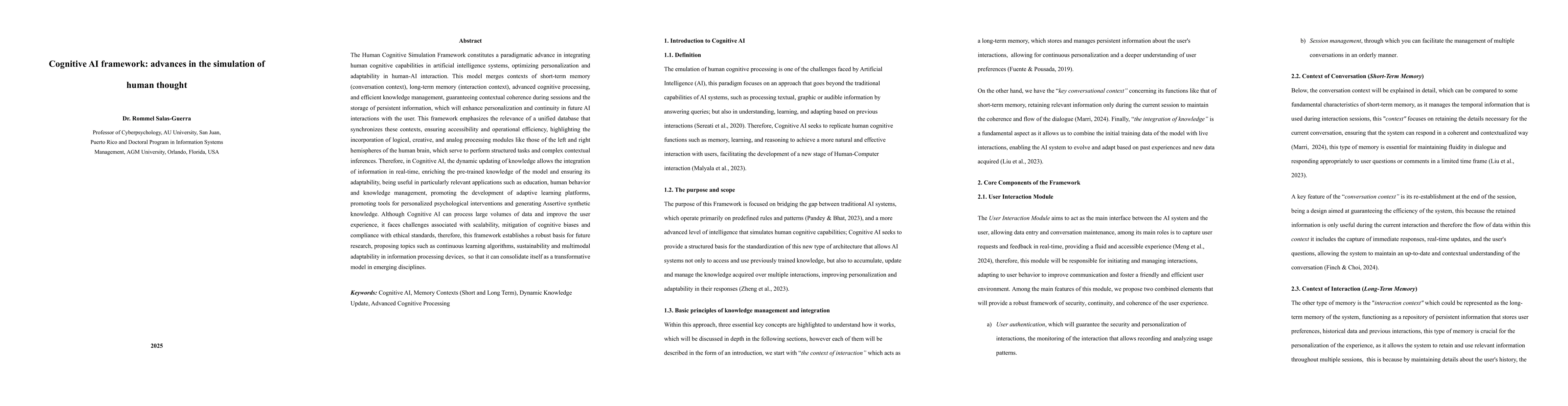 The Human Cognitive Simulation Framework represents a significant advancement in integrating human cognitive capabilities into artificial intelligence systems. By merging short-term memory (conversation context), long-term memory (interaction context), advanced cognitive processing, and efficient knowledge management, it ensures contextual coherence and persistent data storage, enhancing personalization and continuity in human-AI interactions. The framework employs a unified database that synchronizes these contexts while incorporating logical, creative, and analog processing modules inspired by human brain hemispheric functions to perform structured tasks and complex inferences. Dynamic knowledge updates enable real-time integration, improving adaptability and fostering applications in education, behavior analysis, and knowledge management. Despite its potential to process vast data volumes and enhance user experience, challenges remain in scalability, cognitive bias mitigation, and ethical compliance. This framework lays the foundation for future research in continuous learning algorithms, sustainability, and multimodal adaptability, positioning Cognitive AI as a transformative model in emerging fields.