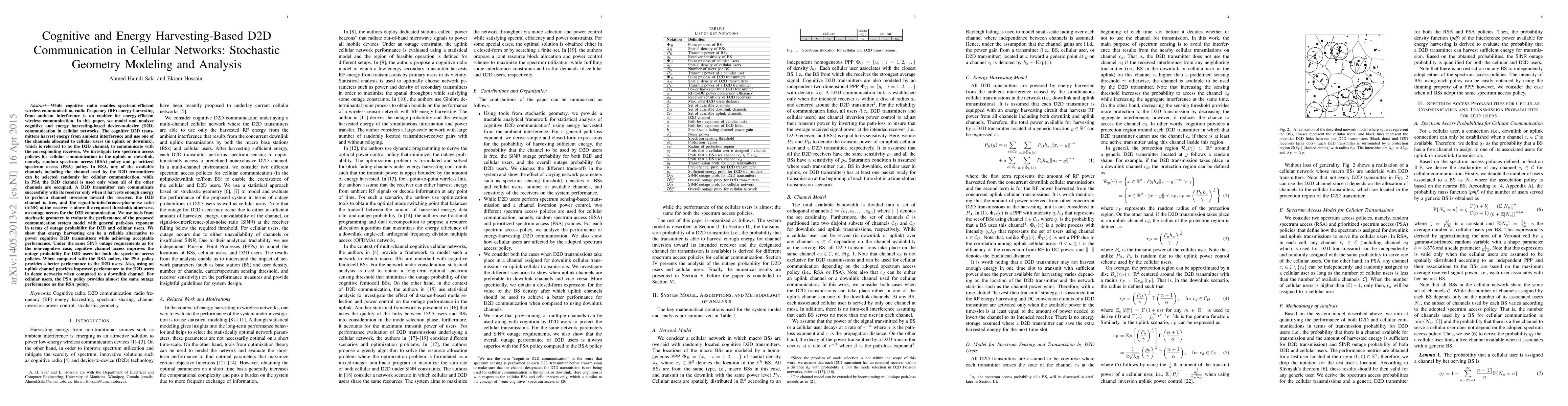 This paper models and analyzes cognitive and energy-harvesting-based Device-to-Device (D2D) communication in cellular networks using stochastic geometry. It evaluates the performance of two spectrum access policies—random spectrum access and prioritized spectrum access—and demonstrates that energy harvesting can reliably power D2D transmitters while improving outage probability for D2D users under both policies.