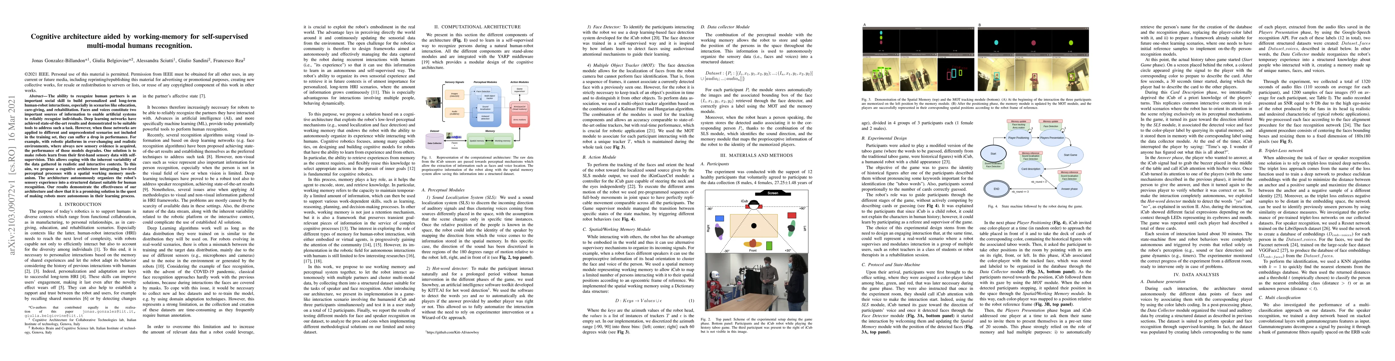 The ability to recognize human partners is an important social skill to build personalized and long-term human-robot interactions, especially in scenarios like education, care-giving, and rehabilitation. Faces and voices constitute two important sources of information to enable artificial systems to reliably recognize individuals. Deep learning networks have achieved state-of-the-art results and demonstrated to be suitable tools to address such a task. However, when those networks are applied to different and unprecedented scenarios not included in the training set, they can suffer a drop in performance. For example, with robotic platforms in ever-changing and realistic environments, where always new sensory evidence is acquired, the performance of those models degrades. One solution is to make robots learn from their first-hand sensory data with self-supervision. This allows coping with the inherent variability of the data gathered in realistic and interactive contexts. To this aim, we propose a cognitive architecture integrating low-level perceptual processes with a spatial working memory mechanism. The architecture autonomously organizes the robot's sensory experience into a structured dataset suitable for human recognition. Our results demonstrate the effectiveness of our architecture and show that it is a promising solution in the quest of making robots more autonomous in their learning process.