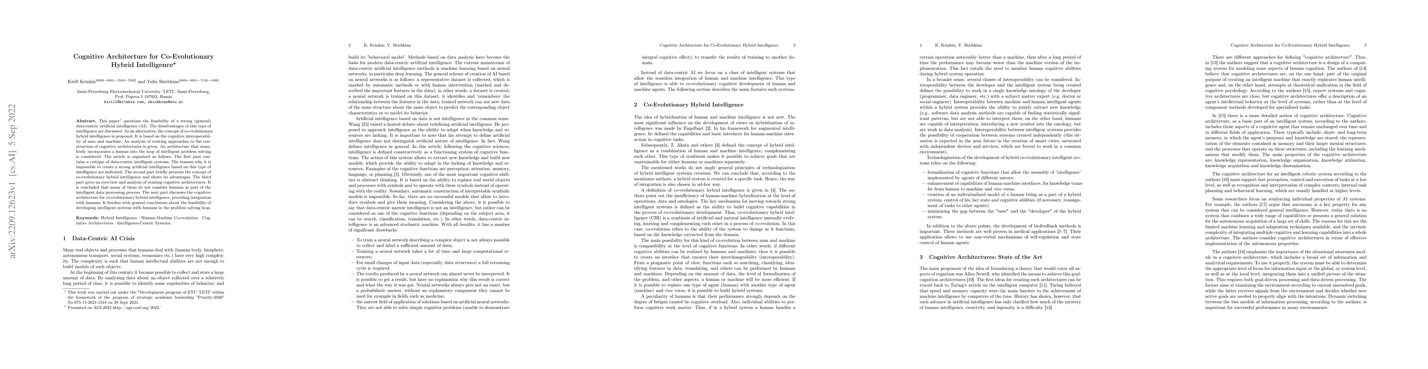 This paper questions the feasibility of a strong (general) data-centric artificial intelligence (AI). The disadvantages of this type of intelligence are discussed. As an alternative, the concept of co-evolutionary hybrid intelligence is proposed. It is based on the cognitive interoperability of man and machine. An analysis of existing approaches to the construction of cognitive architectures is given. An architecture seamlessly incorporates a human into the loop of intelligent problem solving is considered. The article is organized as follows. The first part contains a critique of data-centric intelligent systems. The reasons why it is impossible to create a strong artificial intelligence based on this type of intelligence are indicated. The second part briefly presents the concept of co-evolutionary hybrid intelligence and shows its advantages. The third part gives an overview and analysis of existing cognitive architectures. It is concluded that many do not consider humans part of the intelligent data processing process. The next part discusses the cognitive architecture for co-evolutionary hybrid intelligence, providing integration with humans. It finishes with general conclusions about the feasibility of developing intelligent systems with humans in the problem-solving loop.