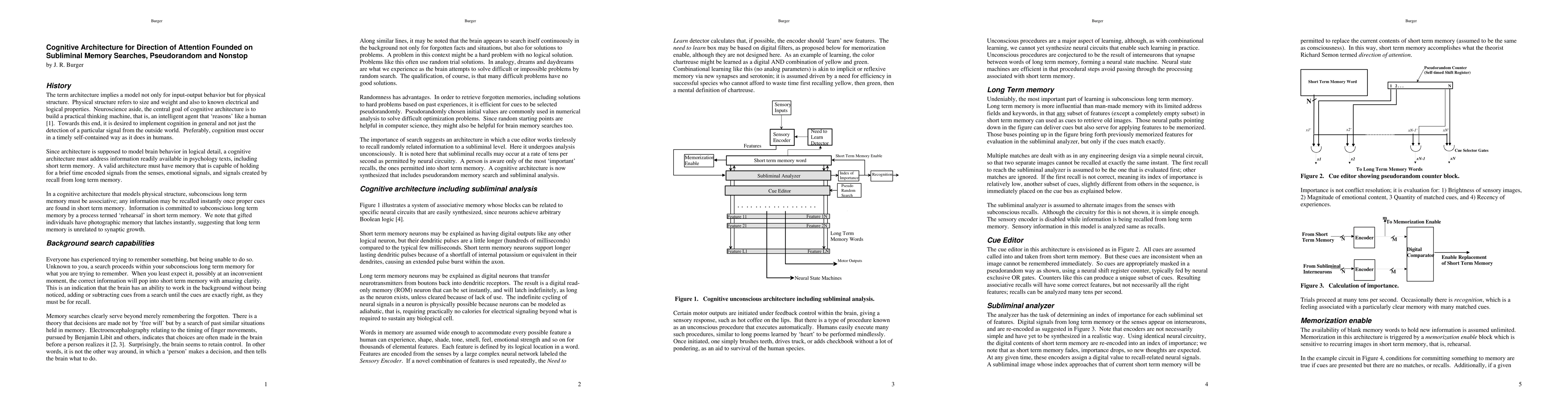 By way of explaining how a brain works logically, human associative memory is modeled with logical and memory neurons, corresponding to standard digital circuits. The resulting cognitive architecture incorporates basic psychological elements such as short term and long term memory. Novel to the architecture are memory searches using cues chosen pseudorandomly from short term memory. Recalls alternated with sensory images, many tens per second, are analyzed subliminally as an ongoing process, to determine a direction of attention in short term memory.
