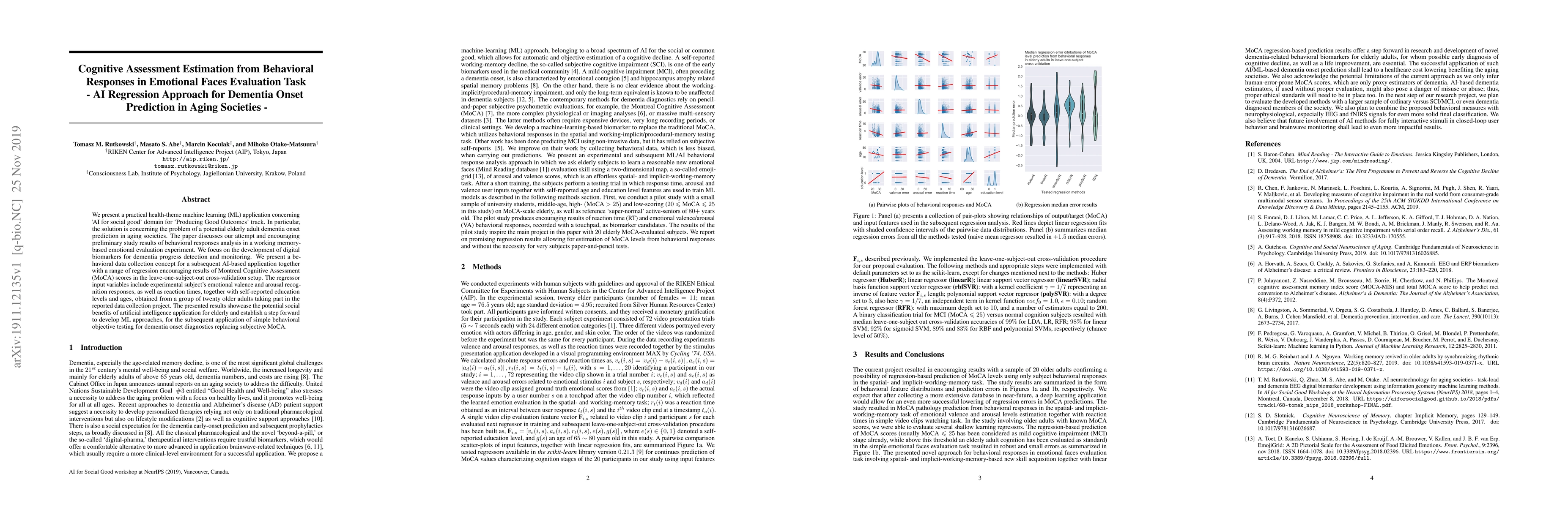 We present a practical health-theme machine learning (ML) application concerning `AI for social good' domain for `Producing Good Outcomes' track. In particular, the solution is concerning the problem of a potential elderly adult dementia onset prediction in aging societies. The paper discusses our attempt and encouraging preliminary study results of behavioral responses analysis in a working memory-based emotional evaluation experiment. We focus on the development of digital biomarkers for dementia progress detection and monitoring. We present a behavioral data collection concept for a subsequent AI-based application together with a range of regression encouraging results of Montreal Cognitive Assessment (MoCA) scores in the leave-one-subject-out cross-validation setup. The regressor input variables include experimental subject's emotional valence and arousal recognition responses, as well as reaction times, together with self-reported education levels and ages, obtained from a group of twenty older adults taking part in the reported data collection project. The presented results showcase the potential social benefits of artificial intelligence application for elderly and establish a step forward to develop ML approaches, for the subsequent application of simple behavioral objective testing for dementia onset diagnostics replacing subjective MoCA.