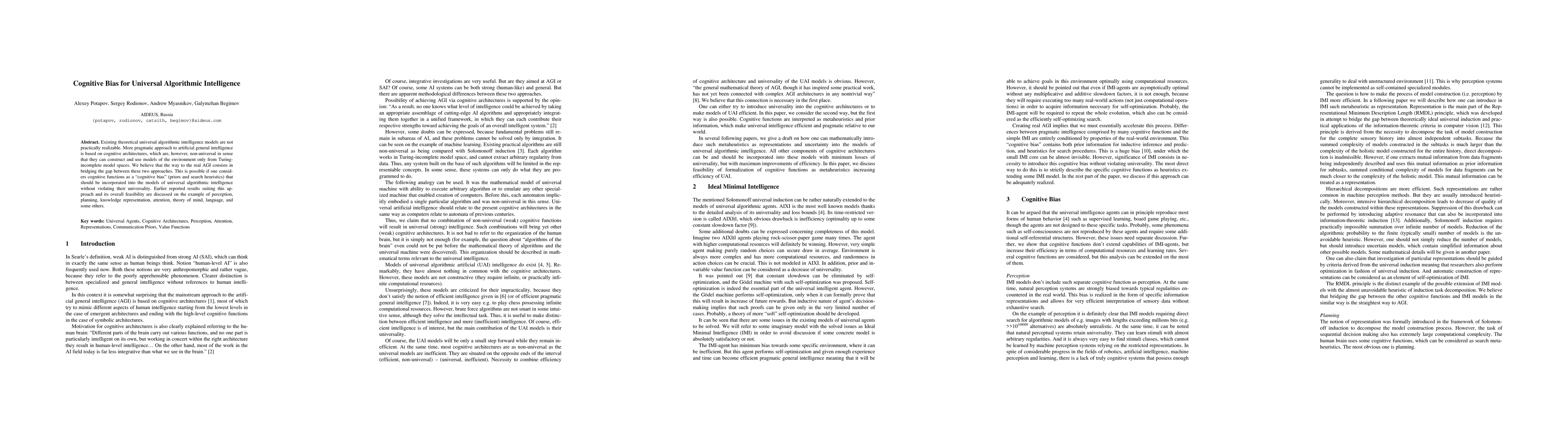 Existing theoretical universal algorithmic intelligence models are not practically realizable. More pragmatic approach to artificial general intelligence is based on cognitive architectures, which are, however, non-universal in sense that they can construct and use models of the environment only from Turing-incomplete model spaces. We believe that the way to the real AGI consists in bridging the gap between these two approaches. This is possible if one considers cognitive functions as a "cognitive bias" (priors and search heuristics) that should be incorporated into the models of universal algorithmic intelligence without violating their universality. Earlier reported results suiting this approach and its overall feasibility are discussed on the example of perception, planning, knowledge representation, attention, theory of mind, language, and some others.