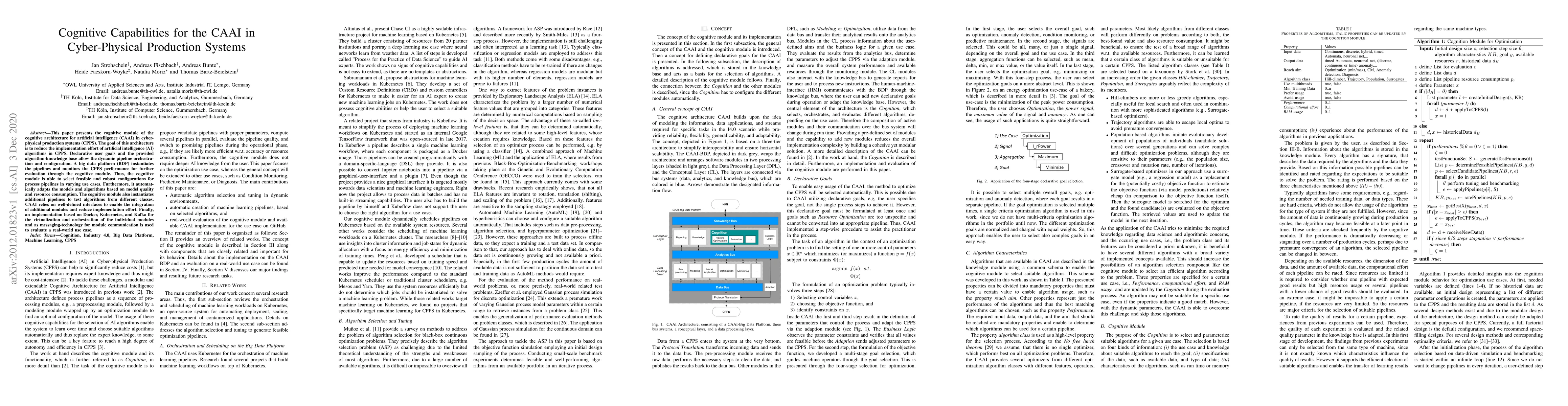 This paper presents the cognitive module of the cognitive architecture for artificial intelligence (CAAI) in cyber-physical production systems (CPPS). The goal of this architecture is to reduce the implementation effort of artificial intelligence (AI) algorithms in CPPS. Declarative user goals and the provided algorithm-knowledge base allow the dynamic pipeline orchestration and configuration. A big data platform (BDP) instantiates the pipelines and monitors the CPPS performance for further evaluation through the cognitive module. Thus, the cognitive module is able to select feasible and robust configurations for process pipelines in varying use cases. Furthermore, it automatically adapts the models and algorithms based on model quality and resource consumption. The cognitive module also instantiates additional pipelines to test algorithms from different classes. CAAI relies on well-defined interfaces to enable the integration of additional modules and reduce implementation effort. Finally, an implementation based on Docker, Kubernetes, and Kafka for the virtualization and orchestration of the individual modules and as messaging-technology for module communication is used to evaluate a real-world use case.