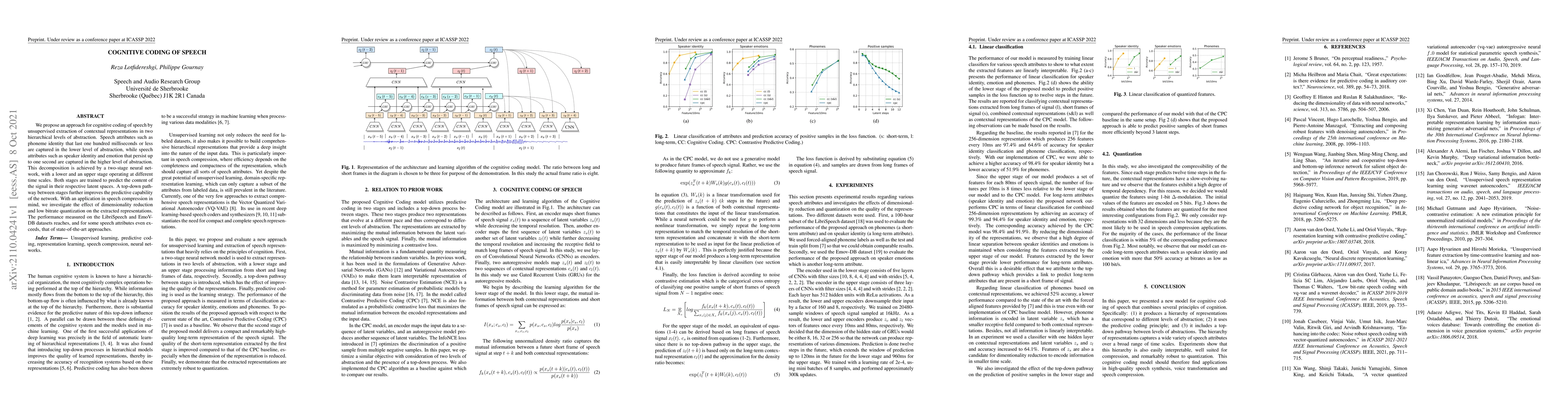 We propose an approach for cognitive coding of speech by unsupervised extraction of contextual representations in two hierarchical levels of abstraction. Speech attributes such as phoneme identity that last one hundred milliseconds or less are captured in the lower level of abstraction, while speech attributes such as speaker identity and emotion that persist up to one second are captured in the higher level of abstraction. This decomposition is achieved by a two-stage neural network, with a lower and an upper stage operating at different time scales. Both stages are trained to predict the content of the signal in their respective latent spaces. A top-down pathway between stages further improves the predictive capability of the network. With an application in speech compression in mind, we investigate the effect of dimensionality reduction and low bitrate quantization on the extracted representations. The performance measured on the LibriSpeech and EmoV-DB datasets reaches, and for some speech attributes even exceeds, that of state-of-the-art approaches.
