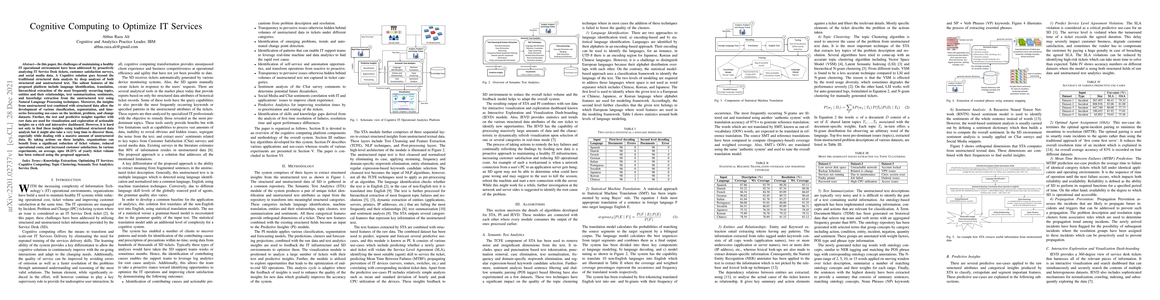 This paper presents a cognitive computing solution to optimize IT services by proactively analyzing IT Service Desk tickets, customer surveys, and social media data. The methodology uses Natural Language Processing to extract topics, entities, sentiments, and knowledge from unstructured text, combined with structured data for classification, segmentation, and forecasting. Results indicate up to 18-25% reduction in yearly ticket volume, leading to cost savings and improved customer satisfaction.