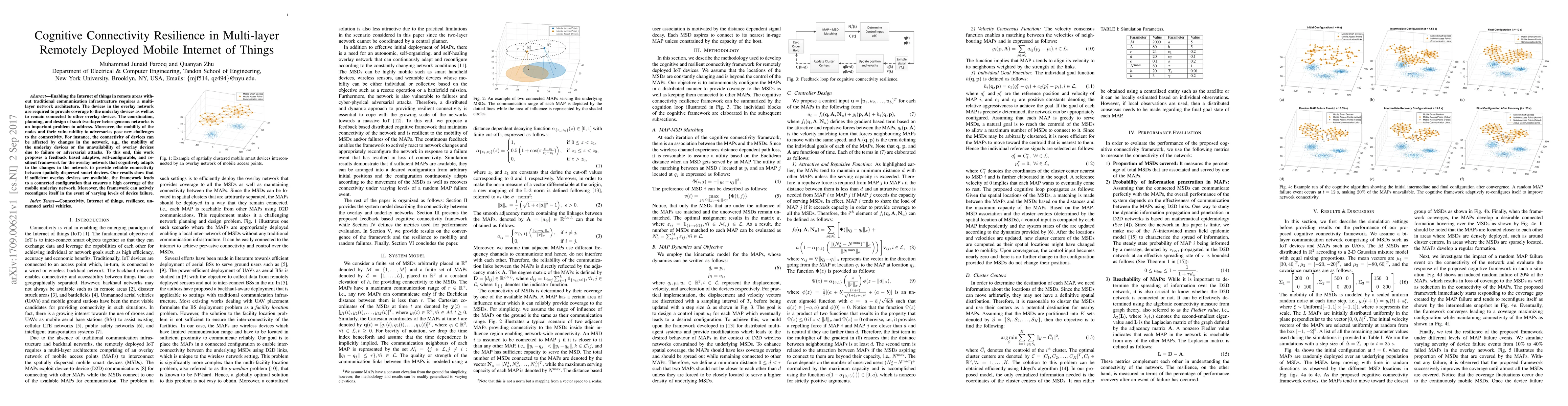 Enabling the Internet of things in remote areas without traditional communication infrastructure requires a multi-layer network architecture. The devices in the overlay network are required to provide coverage to the underlay devices as well as to remain connected to other overlay devices. The coordination, planning, and design of such two-layer heterogeneous networks is an important problem to address. Moreover, the mobility of the nodes and their vulnerability to adversaries pose new challenges to the connectivity. For instance, the connectivity of devices can be affected by changes in the network, e.g., the mobility of the underlay devices or the unavailability of overlay devices due to failure or adversarial attacks. To this end, this work proposes a feedback based adaptive, self-configurable, and resilient framework for the overlay network that cognitively adapts to the changes in the network to provide reliable connectivity between spatially dispersed smart devices. Our results show that if sufficient overlay devices are available, the framework leads to a connected configuration that ensures a high coverage of the mobile underlay network. Moreover, the framework can actively reconfigure itself in the event of varying levels of device failure.