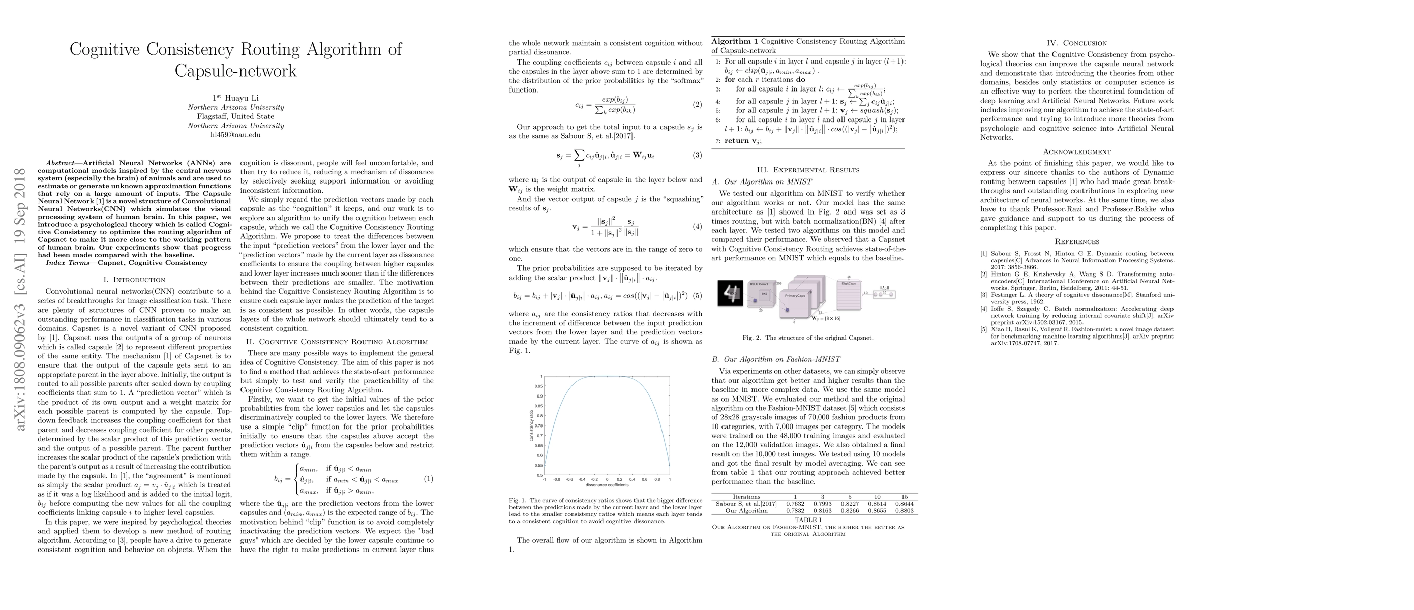 Artificial Neural Networks (ANNs) are computational models inspired by the central nervous system (especially the brain) of animals and are used to estimate or generate unknown approximation functions relied on large amounts of inputs. Capsule Neural Network (Sabour S, et al.[2017]) is a novel structure of Convolutional Neural Networks which simulates the visual processing system of human brain. In this paper, we introduce psychological theories which called Cognitive Consistency to optimize the routing algorithm of Capsnet to make it more close to the work pattern of human brain. It has been shown in the experiment that a progress had been made compared with the baseline.