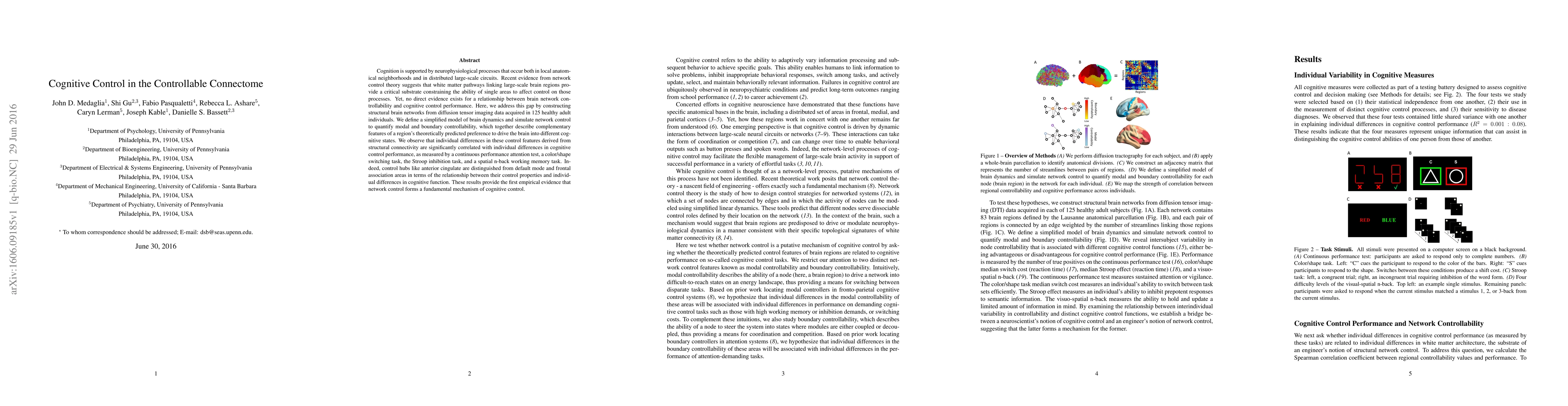 This paper investigates the relationship between brain network controllability and cognitive control performance using diffusion tensor imaging data. It finds significant correlations between individual differences in structural connectivity control features and performance on various cognitive tasks, suggesting that network control is a fundamental mechanism of cognitive control.
