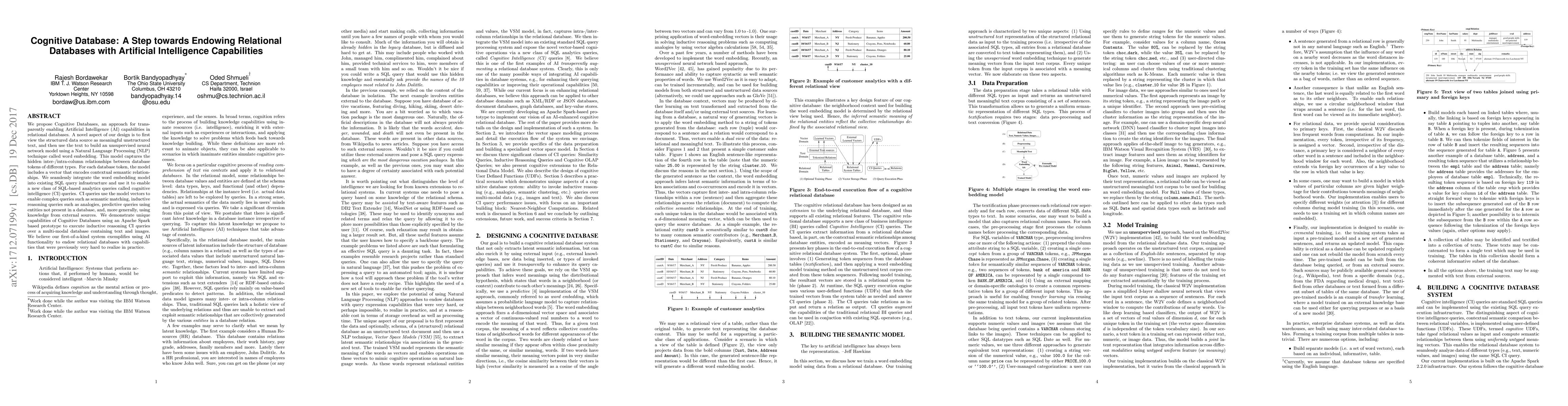 The paper proposes Cognitive Databases to integrate AI into relational databases by treating structured data as unstructured text and using word embeddings to build neural networks that capture relationships. This approach enables new SQL-based analytics queries for semantic matching, inductive reasoning, and predictive analysis.