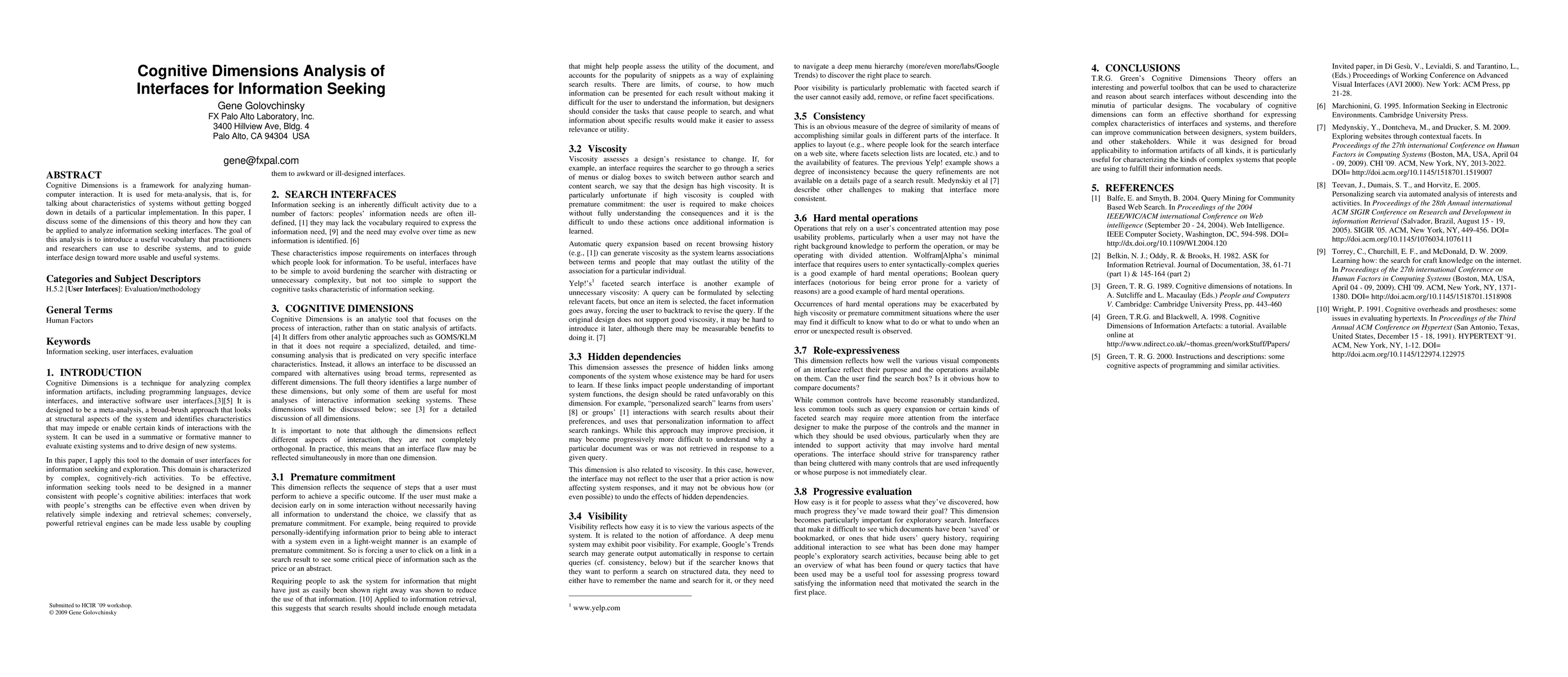 Cognitive Dimensions is a framework for analyzing human-computer interaction. It is used for meta-analysis, that is, for talking about characteristics of systems without getting bogged down in details of a particular implementation. In this paper, I discuss some of the dimensions of this theory and how they can be applied to analyze information seeking interfaces. The goal of this analysis is to introduce a useful vocabulary that practitioners and researchers can use to describe systems, and to guide interface design toward more usable and useful systems
