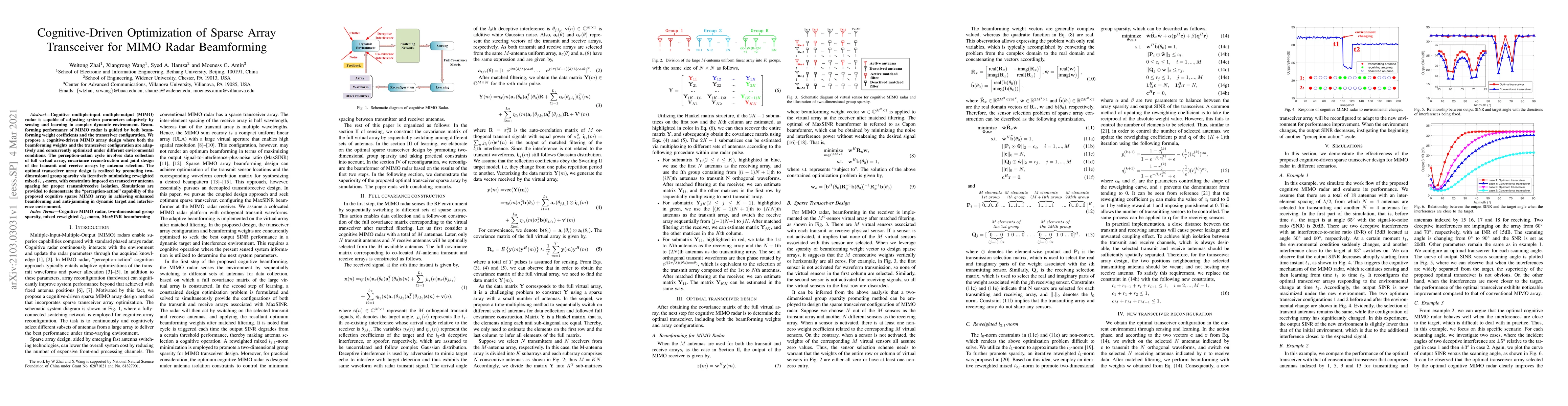 This paper proposes a cognitive-driven optimization approach for sparse array transceivers in MIMO radar systems, where adaptive beamforming weight coefficients and transceiver configurations are jointly optimized. Simulations show improved beamforming and anti-jamming performance in dynamic environments.
