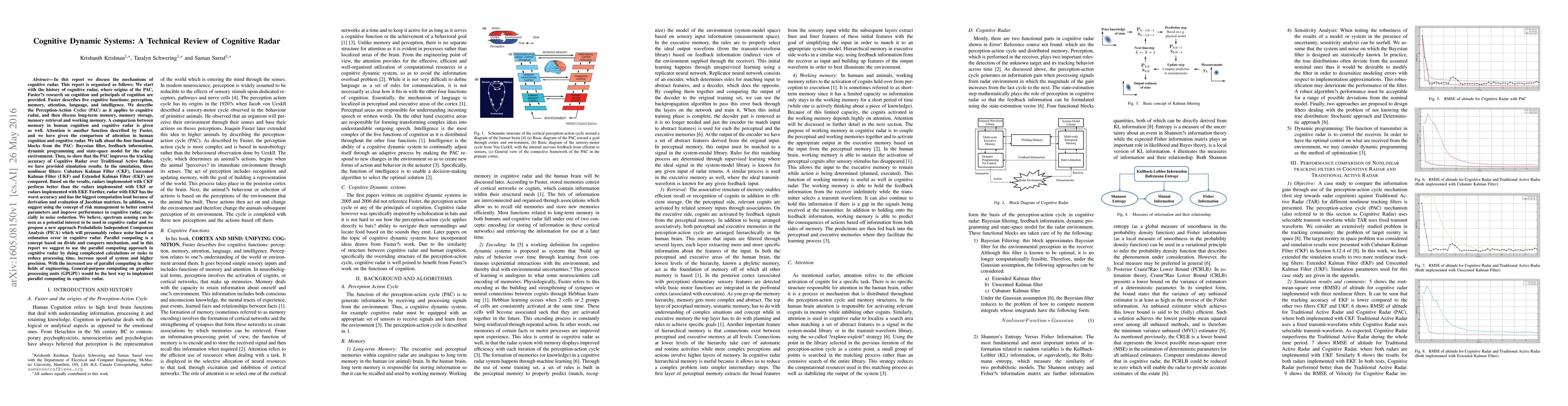 We start with the history of cognitive radar, where origins of the PAC, Fuster research on cognition and principals of cognition are provided. Fuster describes five cognitive functions: perception, memory, attention, language, and intelligence. We describe the Perception-Action Cyclec as it applies to cognitive radar, and then discuss long-term memory, memory storage, memory retrieval and working memory. A comparison between memory in human cognition and cognitive radar is given as well. Attention is another function described by Fuster, and we have given the comparison of attention in human cognition and cognitive radar. We talk about the four functional blocks from the PAC: Bayesian filter, feedback information, dynamic programming and state-space model for the radar environment. Then, to show that the PAC improves the tracking accuracy of Cognitive Radar over Traditional Active Radar, we have provided simulation results. In the simulation, three nonlinear filters: Cubature Kalman Filter, Unscented Kalman Filter and Extended Kalman Filter are compared. Based on the results, radars implemented with CKF perform better than the radars implemented with UKF or radars implemented with EKF. Further, radar with EKF has the worst accuracy and has the biggest computation load because of derivation and evaluation of Jacobian matrices. We suggest using the concept of risk management to better control parameters and improve performance in cognitive radar. We believe, spectrum sensing can be seen as a potential interest to be used in cognitive radar and we propose a new approach Probabilistic ICA which will presumably reduce noise based on estimation error in cognitive radar. Parallel computing is a concept based on divide and conquers mechanism, and we suggest using the parallel computing approach in cognitive radar by doing complicated calculations or tasks to reduce processing time.