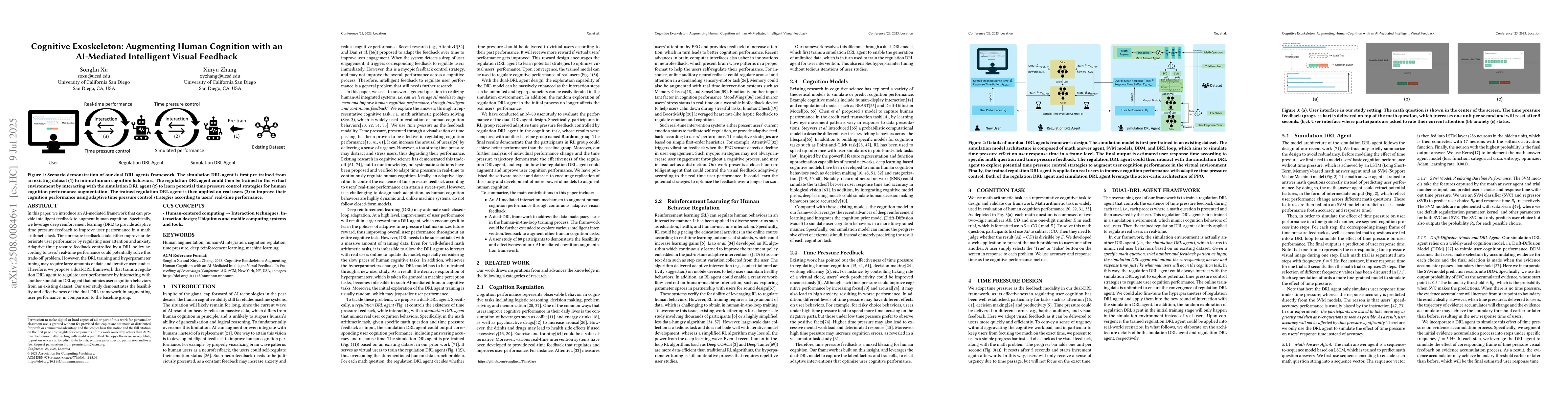 In this paper, we introduce an AI-mediated framework that can provide intelligent feedback to augment human cognition. Specifically, we leverage deep reinforcement learning (DRL) to provide adaptive time pressure feedback to improve user performance in a math arithmetic task. Time pressure feedback could either improve or deteriorate user performance by regulating user attention and anxiety. Adaptive time pressure feedback controlled by a DRL policy according to users' real-time performance could potentially solve this trade-off problem. However, the DRL training and hyperparameter tuning may require large amounts of data and iterative user studies. Therefore, we propose a dual-DRL framework that trains a regulation DRL agent to regulate user performance by interacting with another simulation DRL agent that mimics user cognition behaviors from an existing dataset. Our user study demonstrates the feasibility and effectiveness of the dual-DRL framework in augmenting user performance, in comparison to the baseline group.