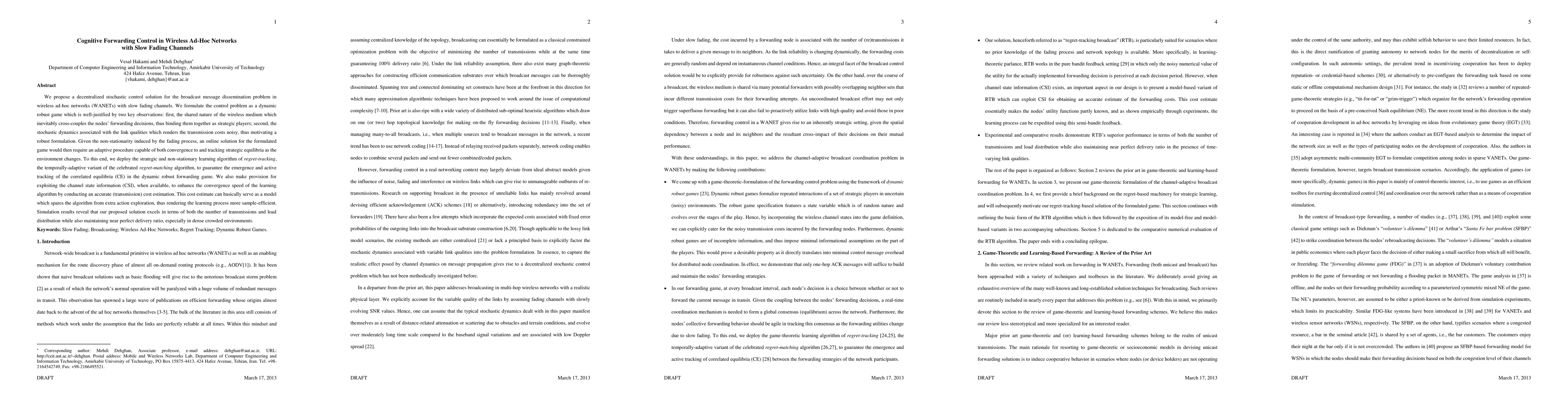 We propose a decentralized stochastic control solution for the broadcast message dissemination problem in wireless ad hoc networks with slow fading channels. We formulate the control problem as a dynamic robust game which is well justified by two key observations; first, the shared nature of the wireless medium which inevitably cross-couples the nodes' forwarding decisions, thus binding them together as strategic players; second, the stochastic dynamics associated with the link qualities which renders the transmission costs noisy, thus motivating a robust formulation. Given the non stationarity induced by the fading process, an online solution for the formulated game would then require an adaptive procedure capable of both convergence to and tracking strategic equilibria as the environment changes. To this end, we deploy the strategic and non stationary learning algorithm of regret tracking, the temporally adaptive variant of the celebrated regret matching algorithm, to guarantee the emergence and active tracking of the correlated equilibria in the dynamic robust forwarding game. We also make provision for exploiting the channel state information, when available, to enhance the convergence speed of the learning algorithm by conducting an accurate transmission cost estimation. This cost estimate can basically serve as a model which spares the algorithm from extra action exploration, thus rendering the learning process more sample efficient. Simulation results reveal that our proposed solution excels in terms of both the number of transmissions and load distribution while also maintaining near perfect delivery ratio, especially in dense crowded environments.