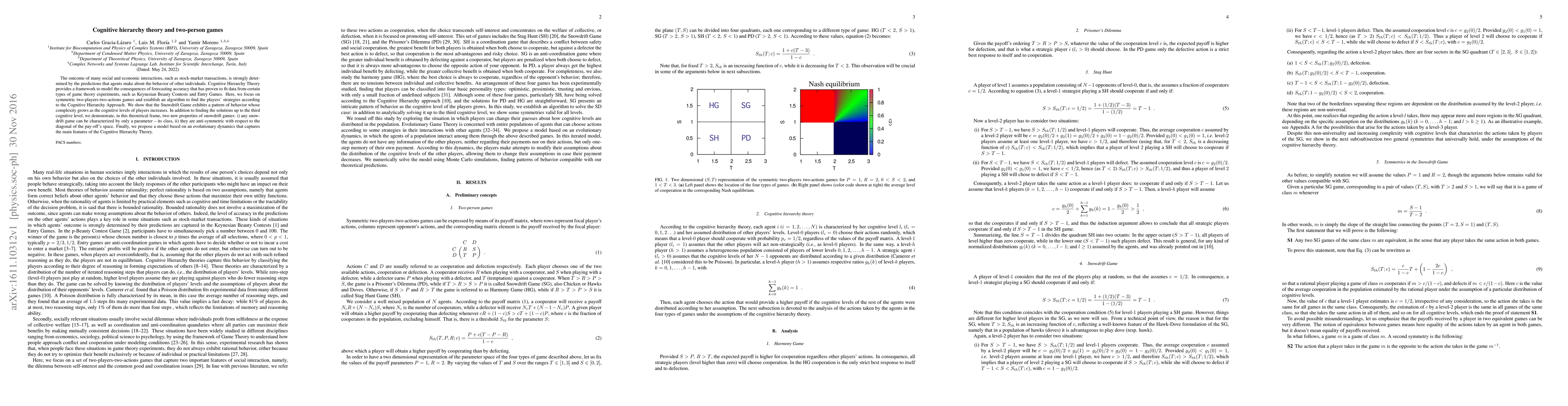 This paper applies Cognitive Hierarchy Theory to two-player games, finding that complexity increases with player cognitive levels and introducing new properties of snowdrift games, including symmetry and a single defining parameter.
