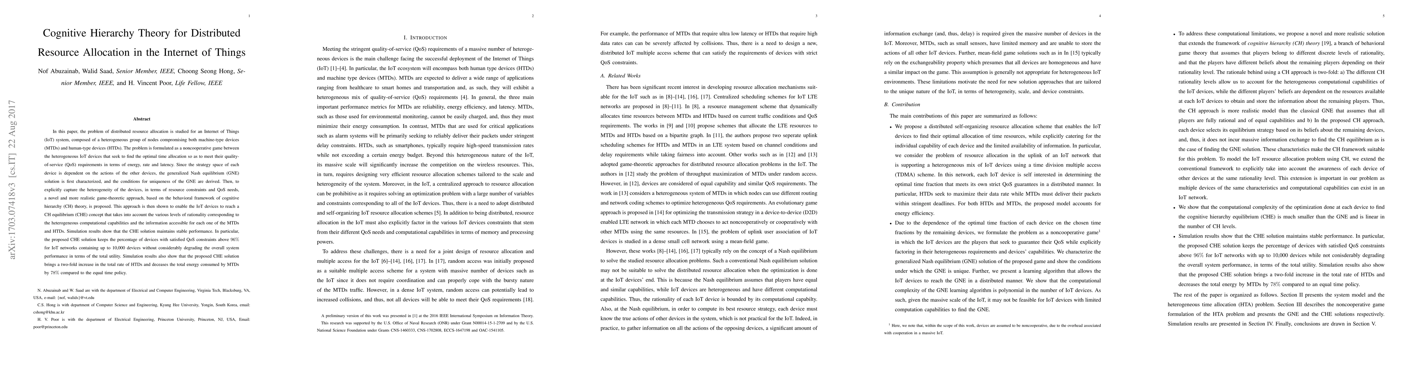 This research introduces a cognitive hierarchy theory-based approach for optimizing resource allocation in IoT networks with diverse devices. The method effectively ensures high QoS satisfaction, maintaining over 96% device QoS constraints even in large networks of up to 10,000 devices, without significantly impacting overall system performance.