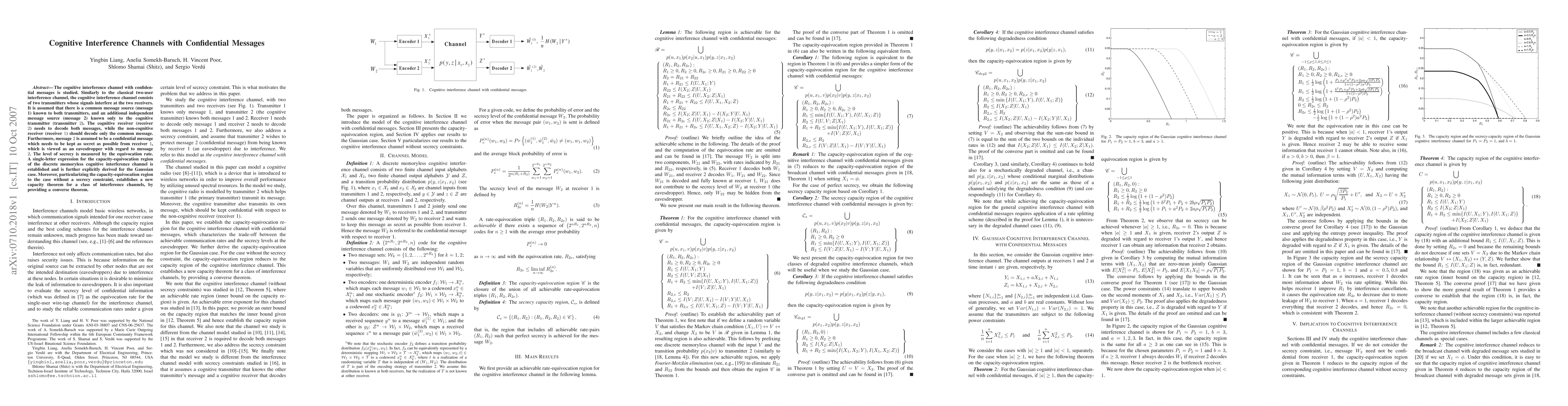 This paper investigates the capacity-equivocation region for a cognitive interference channel with confidential messages, establishing a single-letter expression for the region and deriving it explicitly for the Gaussian case. It also provides a new capacity theorem for interference channels without secrecy constraints.