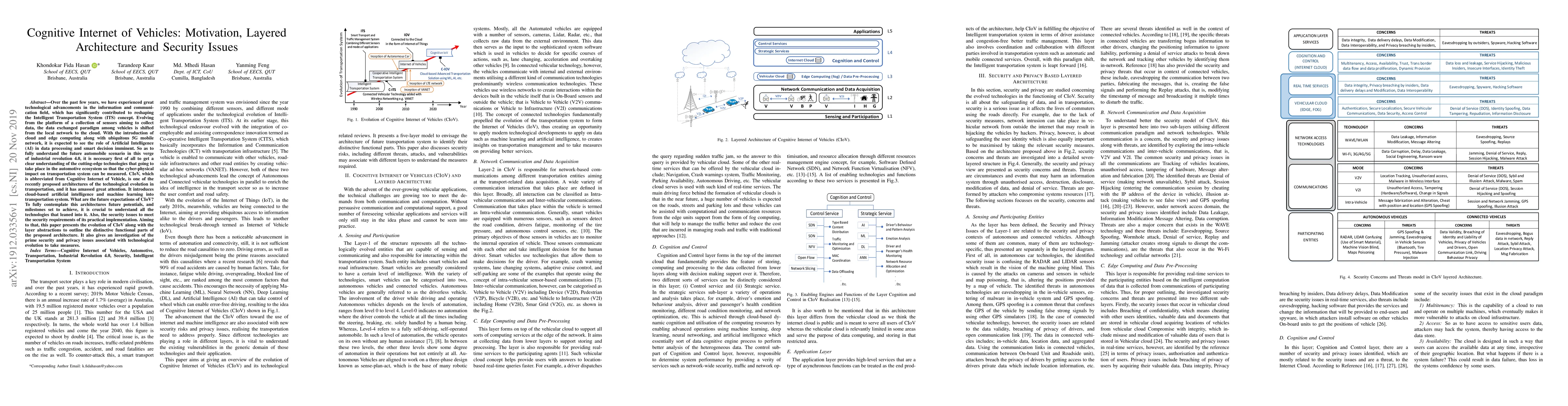 This paper explores the Cognitive Internet of Vehicles (CIoV), detailing its layered architecture and the integration of cloud and edge computing with AI for intelligent transportation systems. It also investigates the critical security issues that must be addressed to ensure the practical implementation of CIoV in the evolving automotive ecosystem.