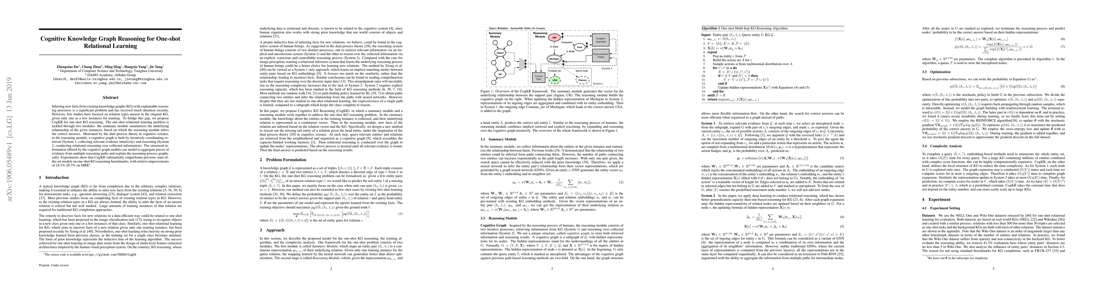 This paper introduces CogKR, a model for one-shot relational learning in knowledge graphs, which uses cognitive graph reasoning to infer new facts from limited instances. It outperforms previous methods by 24.3%-29.7% on benchmarks, leveraging a dual-process theory-inspired approach combining intuitive evidence retrieval and relational reasoning.