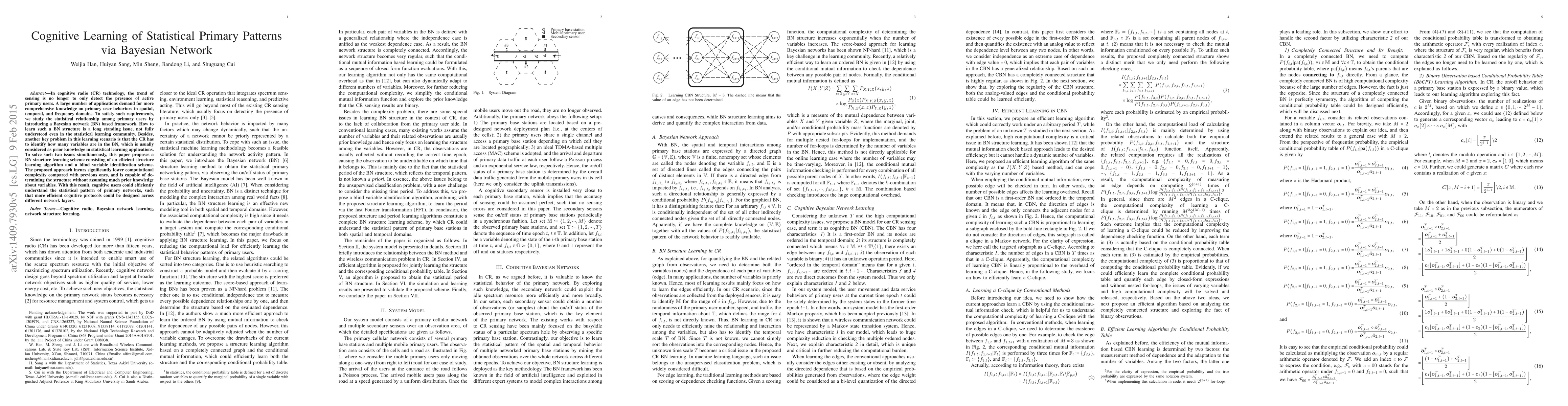 In cognitive radio (CR) technology, the trend of sensing is no longer to only detect the presence of active primary users. A large number of applications demand for more comprehensive knowledge on primary user behaviors in spatial, temporal, and frequency domains. To satisfy such requirements, we study the statistical relationship among primary users by introducing a Bayesian network (BN) based framework. How to learn such a BN structure is a long standing issue, not fully understood even in the statistical learning community. Besides, another key problem in this learning scenario is that the CR has to identify how many variables are in the BN, which is usually considered as prior knowledge in statistical learning applications. To solve such two issues simultaneously, this paper proposes a BN structure learning scheme consisting of an efficient structure learning algorithm and a blind variable identification scheme. The proposed approach incurs significantly lower computational complexity compared with previous ones, and is capable of determining the structure without assuming much prior knowledge about variables. With this result, cognitive users could efficiently understand the statistical pattern of primary networks, such that more efficient cognitive protocols could be designed across different network layers.