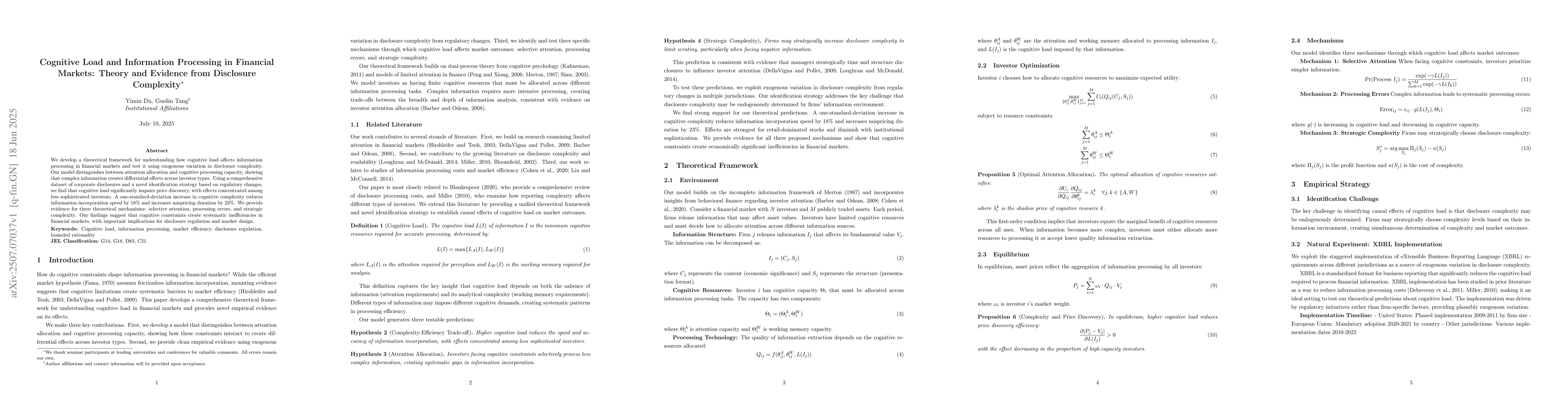We develop a theoretical framework for understanding how cognitive load affects information processing in financial markets and test it using exogenous variation in disclosure complexity. Our model distinguishes between attention allocation and cognitive processing capacity, showing that complex information creates differential effects across investor types. Using a comprehensive dataset of corporate disclosures and a novel identification strategy based on regulatory changes, we find that cognitive load significantly impairs price discovery, with effects concentrated among less sophisticated investors. A one-standard-deviation increase in cognitive complexity reduces information incorporation speed by 18\% and increases mispricing duration by 23\%. We provide evidence for three theoretical mechanisms: selective attention, processing errors, and strategic complexity. Our findings suggest that cognitive constraints create systematic inefficiencies in financial markets, with important implications for disclosure regulation and market design.