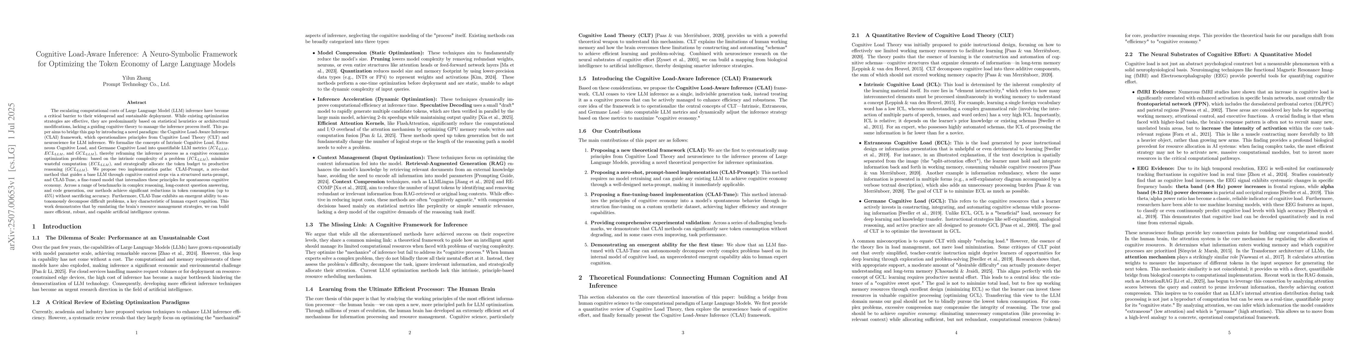 The escalating computational costs of Large Language Model (LLM) inference have become a critical barrier to their widespread and sustainable deployment. While existing optimization strategies are effective, they are predominantly based on statistical heuristics or architectural modifications, lacking a guiding cognitive theory to manage the inference process itself. This paper aims to bridge this gap by introducing a novel paradigm: the Cognitive Load-Aware Inference (CLAI) framework, which operationalizes principles from Cognitive Load Theory (CLT) and neuroscience for LLM inference. We formalize the concepts of Intrinsic Cognitive Load, Extraneous Cognitive Load, and Germane Cognitive Load into quantifiable LLM metrics ($ICL_{LLM}$, $ECL_{LLM}$, and $GCL_{LLM}$), thereby reframing the inference process as a cognitive economics optimization problem: based on the intrinsic complexity of a problem ($ICL_{LLM}$), minimize wasteful computation ($ECL_{LLM}$), and strategically allocate the token budget to productive reasoning ($GCL_{LLM}$). We propose two implementation paths: CLAI-Prompt, a zero-shot method that guides a base LLM through cognitive control steps via a structured meta-prompt, and CLAI-Tune, a fine-tuned model that internalizes these principles for spontaneous cognitive economy. Across a range of benchmarks in complex reasoning, long-context question answering, and code generation, our methods achieve significant reductions in token consumption (up to 45\%) without sacrificing accuracy. Furthermore, CLAI-Tune exhibits an emergent ability to autonomously decompose difficult problems, a key characteristic of human expert cognition. This work demonstrates that by emulating the brain's resource management strategies, we can build more efficient, robust, and capable artificial intelligence systems.